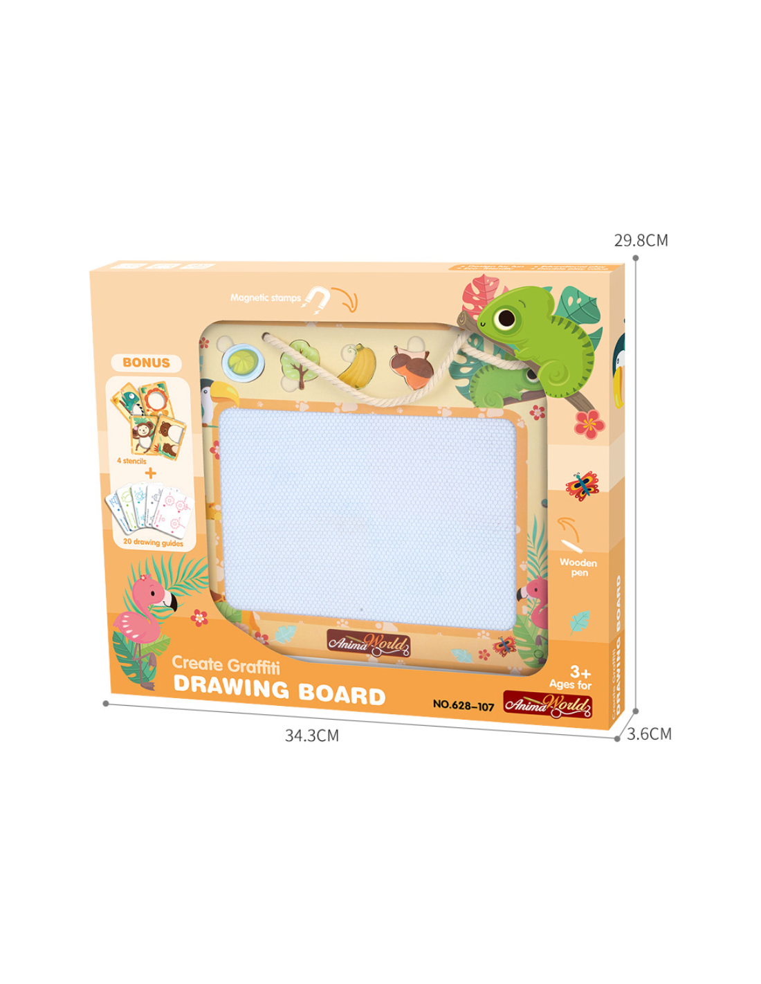 Wraz z tablicą (znikopisem) są 4 magnetyczne stempelki oraz drewniany rysik, a także 20 kart z instrukcjami rysowania, oraz 4 szablony.