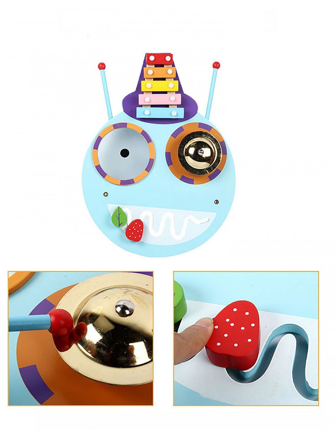 Ruchome koła zębate, oraz bardzo ładnie brzmiące cymbałki urozmaicają zabawę z naszą stonogą.