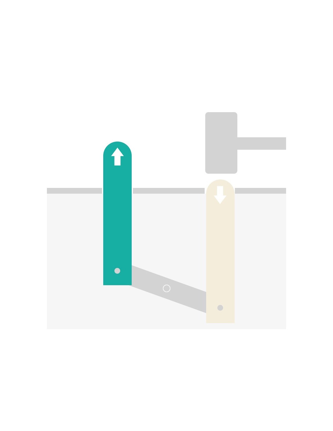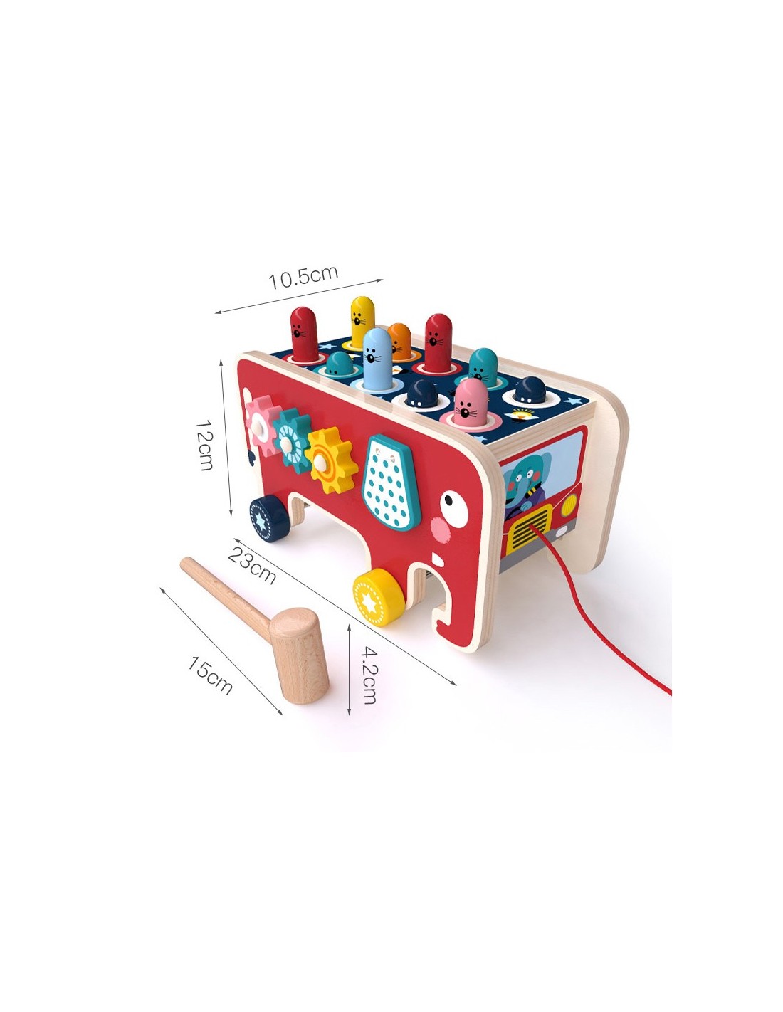 Na górze znajduje się wbijak, który zachęca do wbijania wyskakujących elementów dołączonymi młoteczkami. Dziecko przy okazji ćwiczy swoją koordynację wzrokowo-ruchową i ćwiczy chwyt.