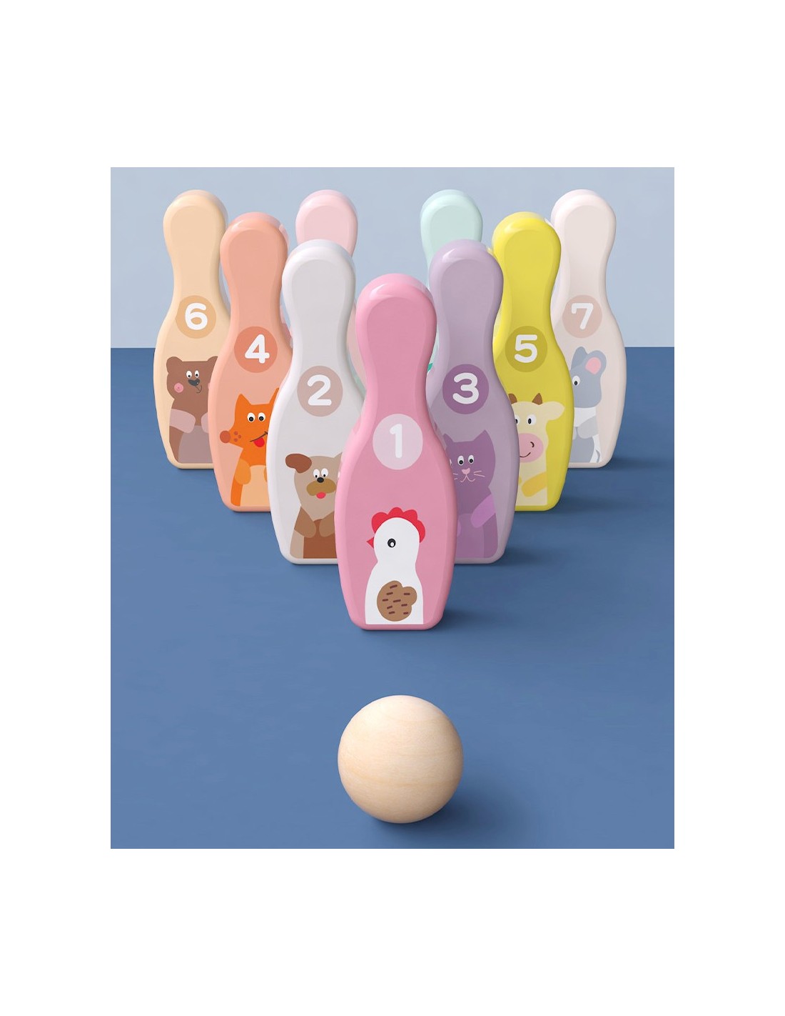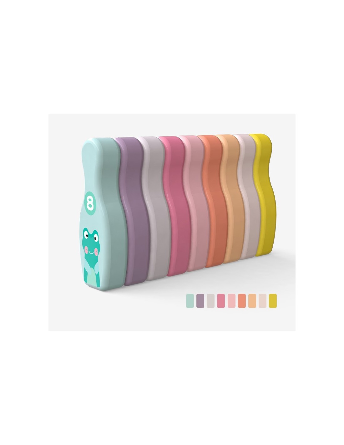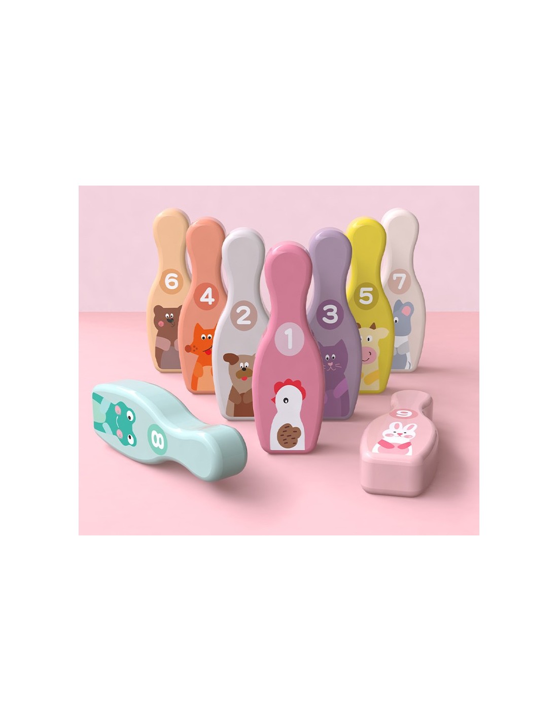 Zestaw kolorowych kręgli dla dzieci w modnych, pastelowych kolorach. Na każdym kręglu znajduje się cyfra i zwierzątko.