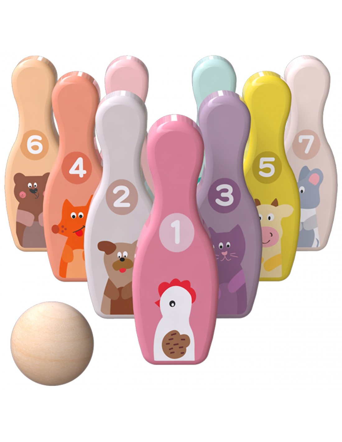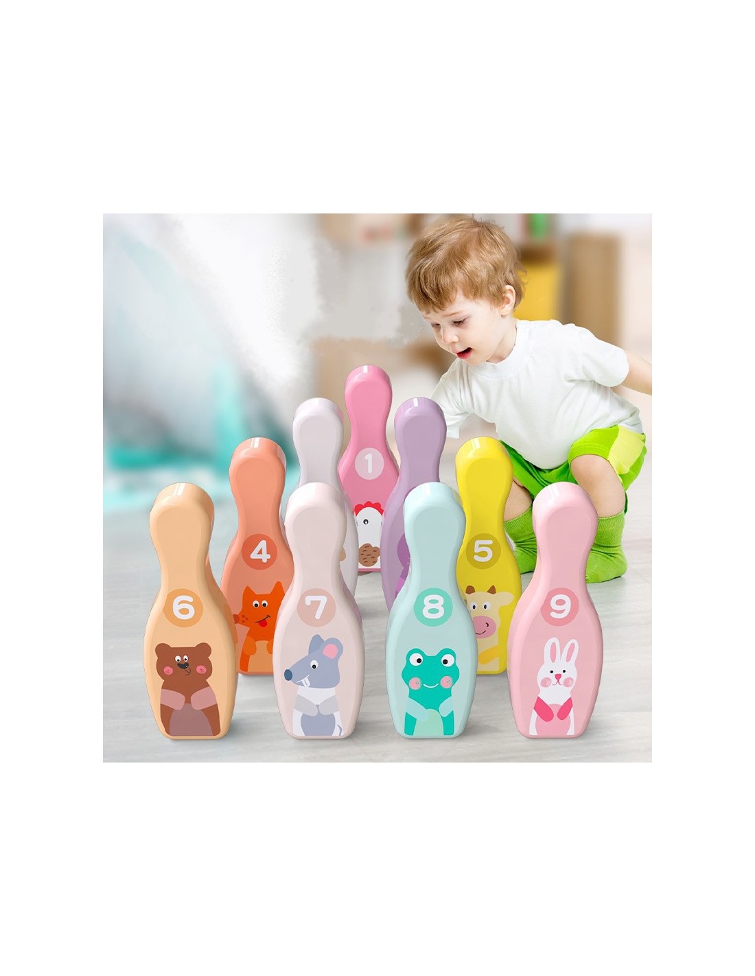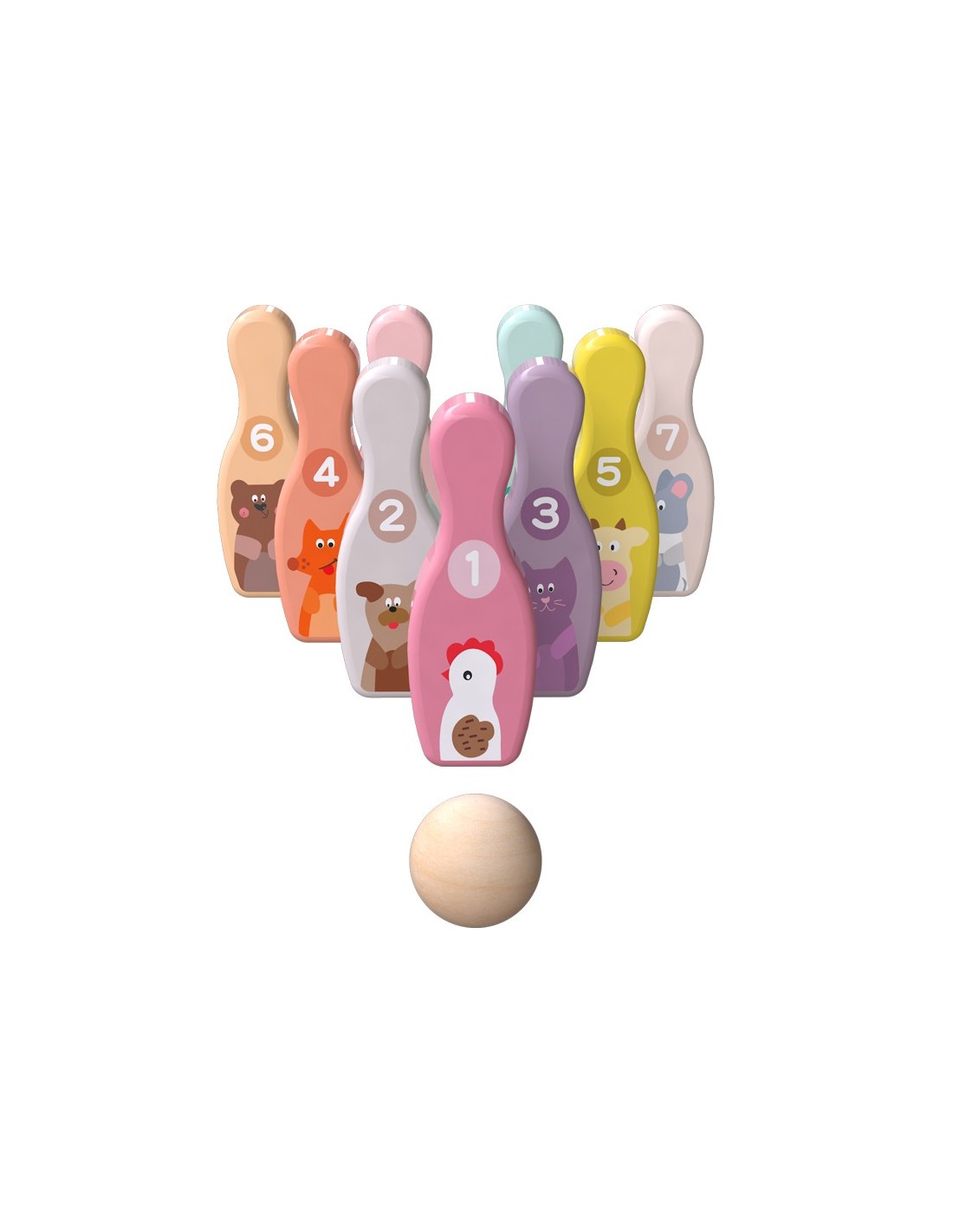 Zestaw kolorowych kręgli dla dzieci w modnych, pastelowych kolorach. Na każdym kręglu znajduje się cyfra i zwierzątko.