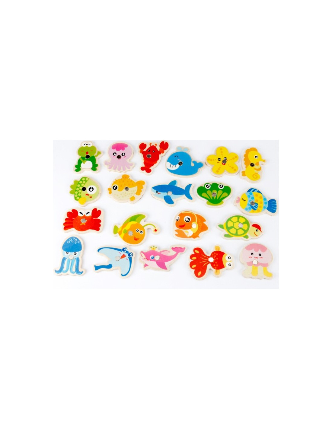 Puzzle posiadają magnes dzięki temu za pomocą wędki można je łowić. Dzięki zabawie dziecko rozwija zdolności manuale, ćwiczy koncentracje, precyzyjność i cierpliwości. Puzzle posiadają magnes dzięki temu za pomocą wędki dopasowuje się kształty. Dzięki zabawie dziecko rozwija zdolności manuale, ćwiczy koncentrację, precyzyjność i cierpliwość. Zestaw składa się z : - 30 drewnianych puzzli do układania planszy - 20 szt. zwierzątek morskich drewnianych z magnesami - 2 wędki - pudełko do przechowywania