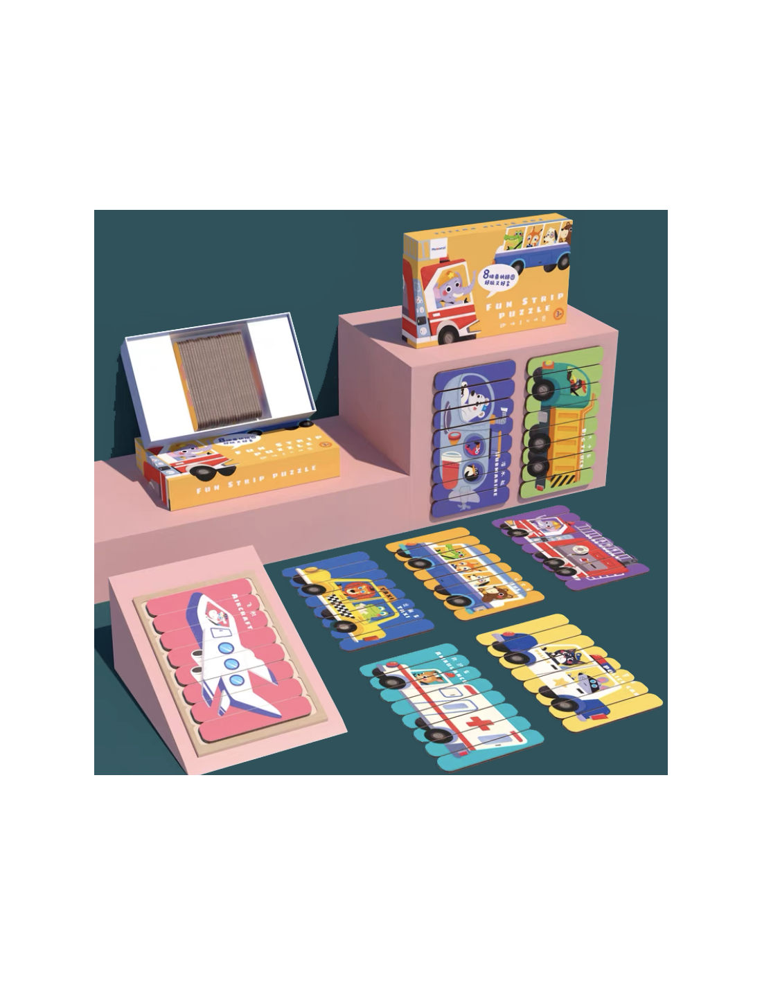 Puzzle w kształcie patyczków z pojazdami. Każdy obrazek składa się z 8 elementów. Patyczki są obustronne, więc można łącznie ułożyć 8 różnych obrazków, takich jak samolot, łódź podwodna, śmieciarka, straż pożarna, autobus, taksówka, karetka i policja. Całość zapakowana w pudełko ułatwiające przechowywanie i pomagające zachować porządek.