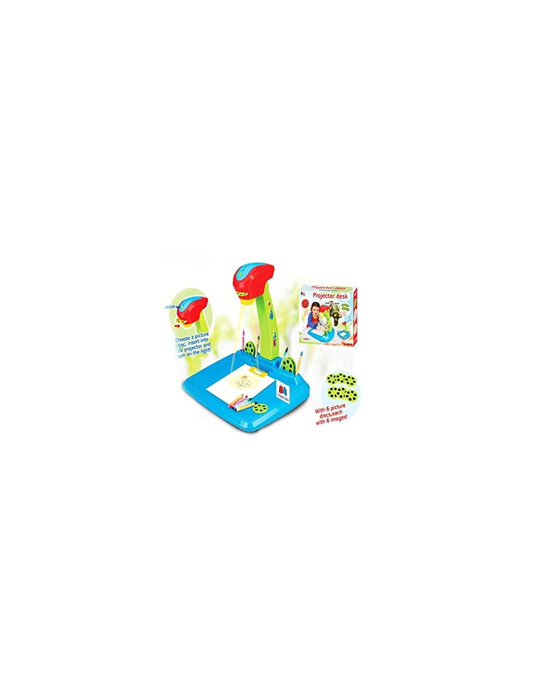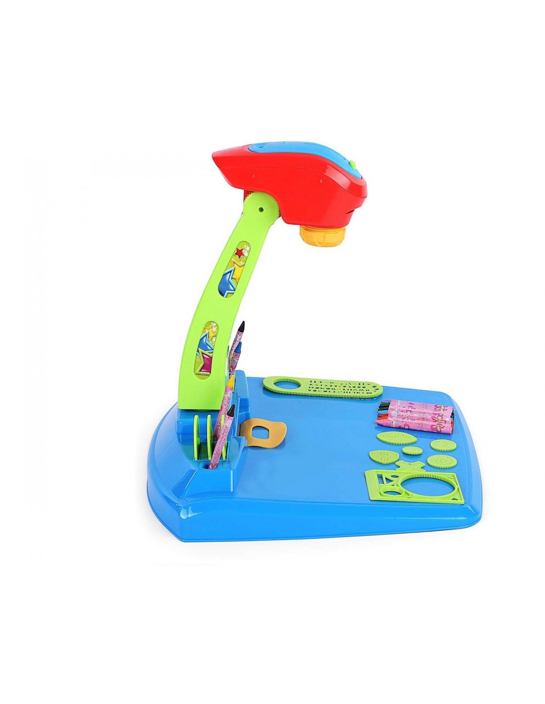 W podstawie projektora są specjalne otwory na kredki i krążki. W zestawie najdziesz również specjalne szablony, którymi możesz tworzyć fantazyjne wzory.