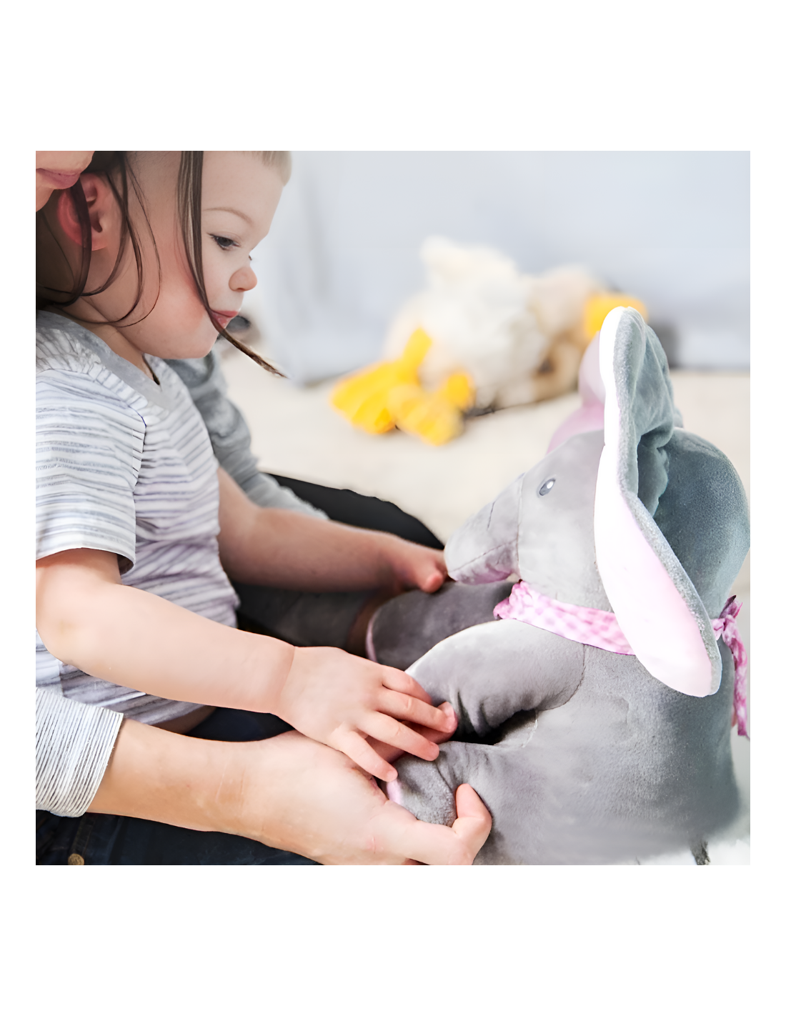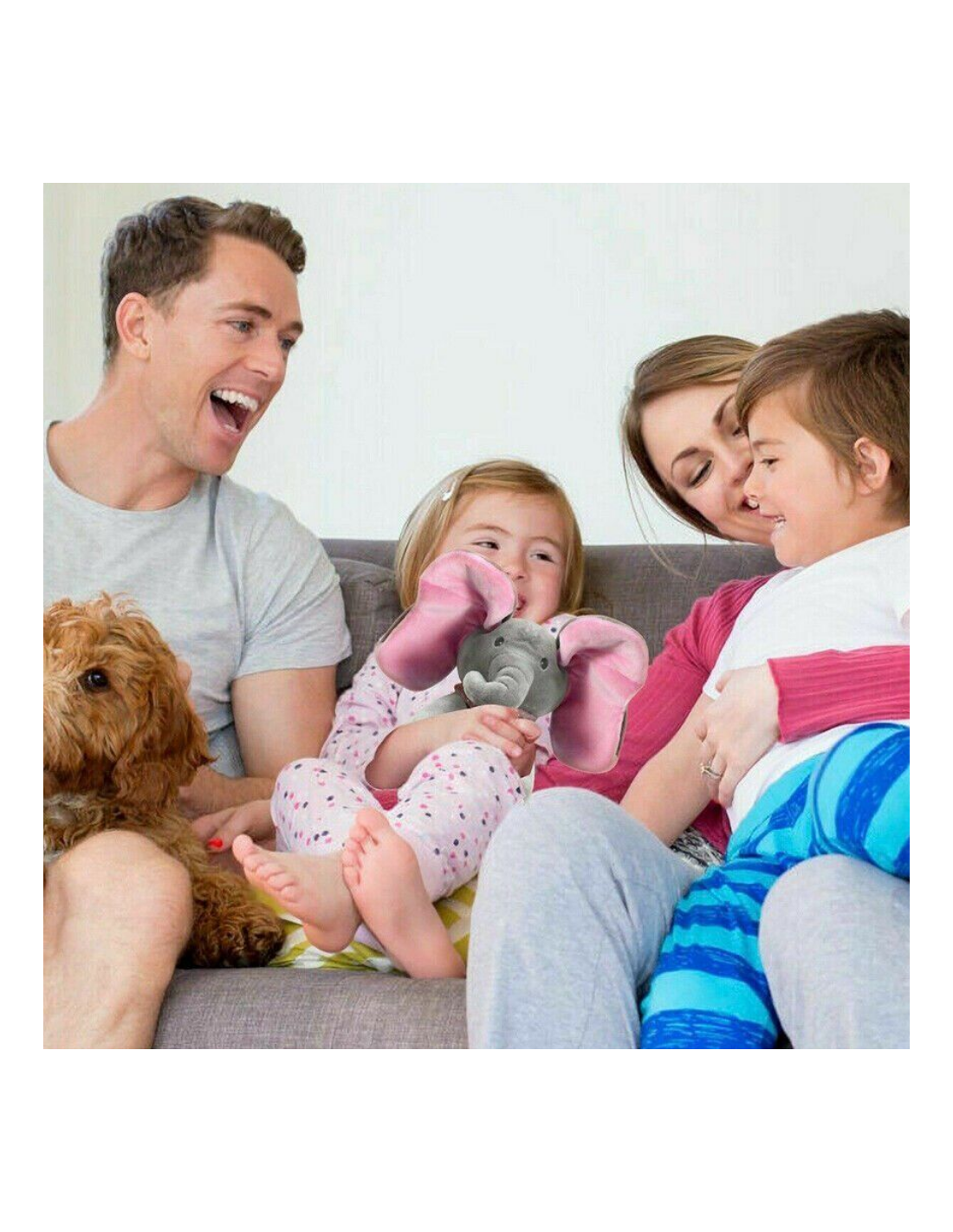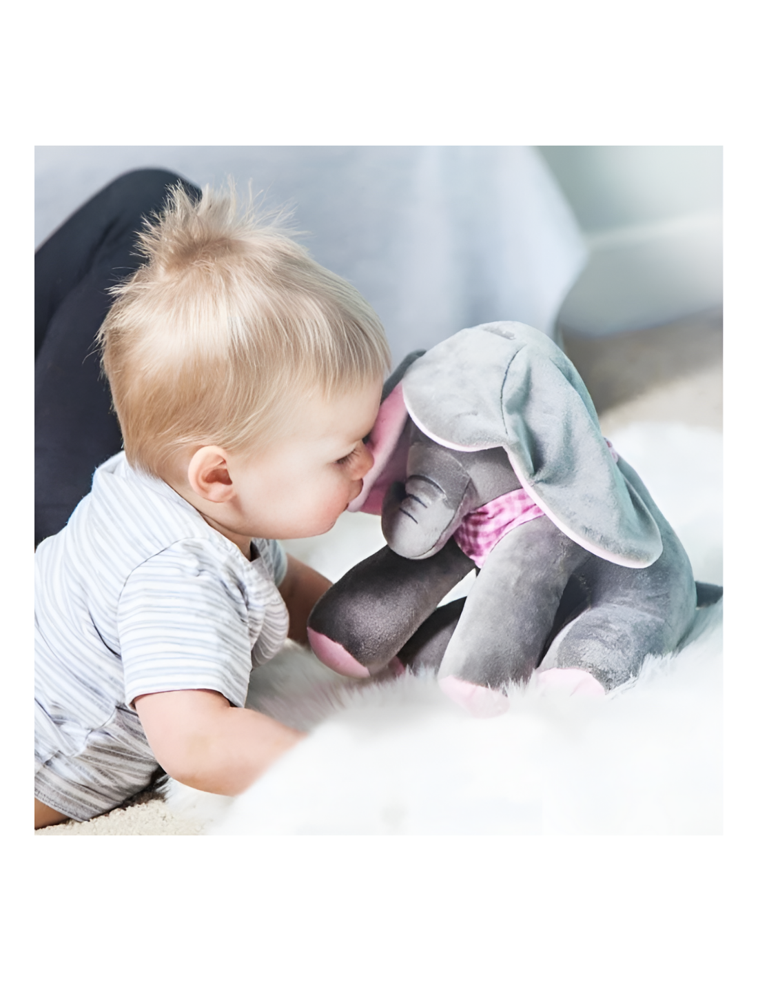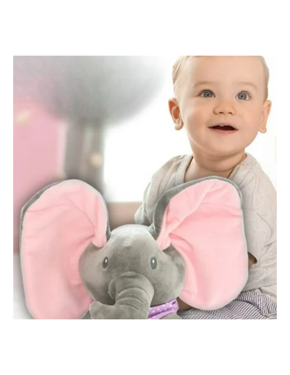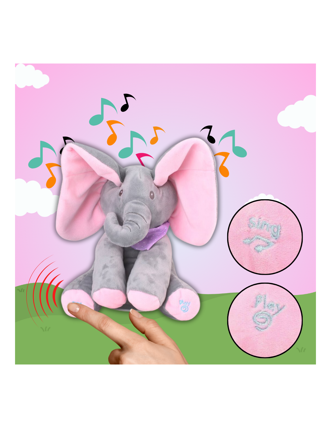 - Po naciśnięciu przycisku PLAY słonik rozmawia i bawi się w chowanego z Twoim dzieckiem zakrywając oczka uszami. Dźwięk i ruch przyciągają uwagę dziecka.
