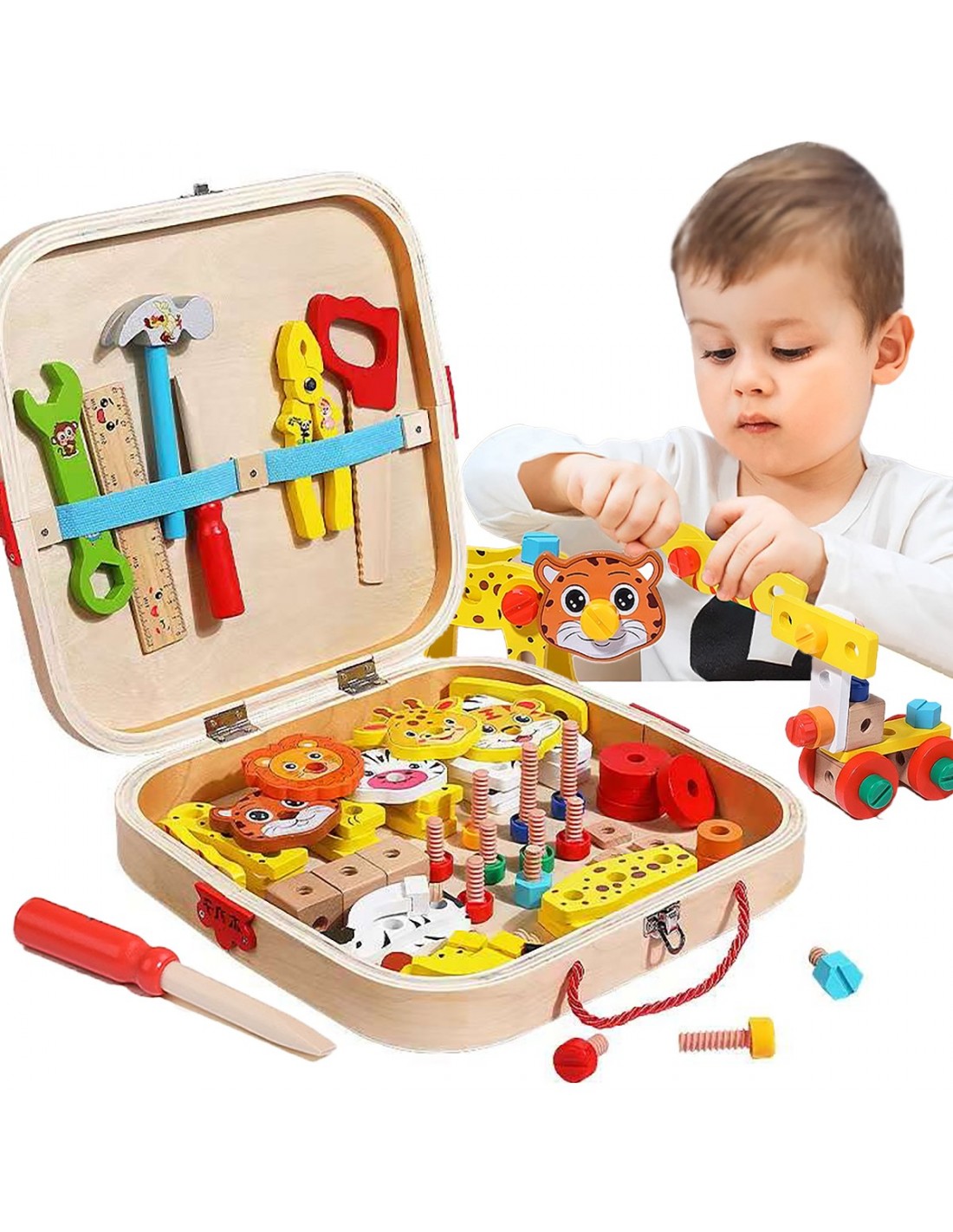 Ten kompletny zestaw narzędziowy jest odpowiedni dla dzieci w wieku 3 lat i więcej. Zestaw zawiera m.in. młotek, klucz, wkrętak, śrubki, piłę, miarkę, a nawet kombinerki. Do tego znajudją się cześci do zbudowania rożnego rodzaju zwierząt. Dzięki temu nie tylko Twoje dziecko może udawać majsterkowicza, ale także poczuć się bezpieczne i odpowiednio wyposażone.
