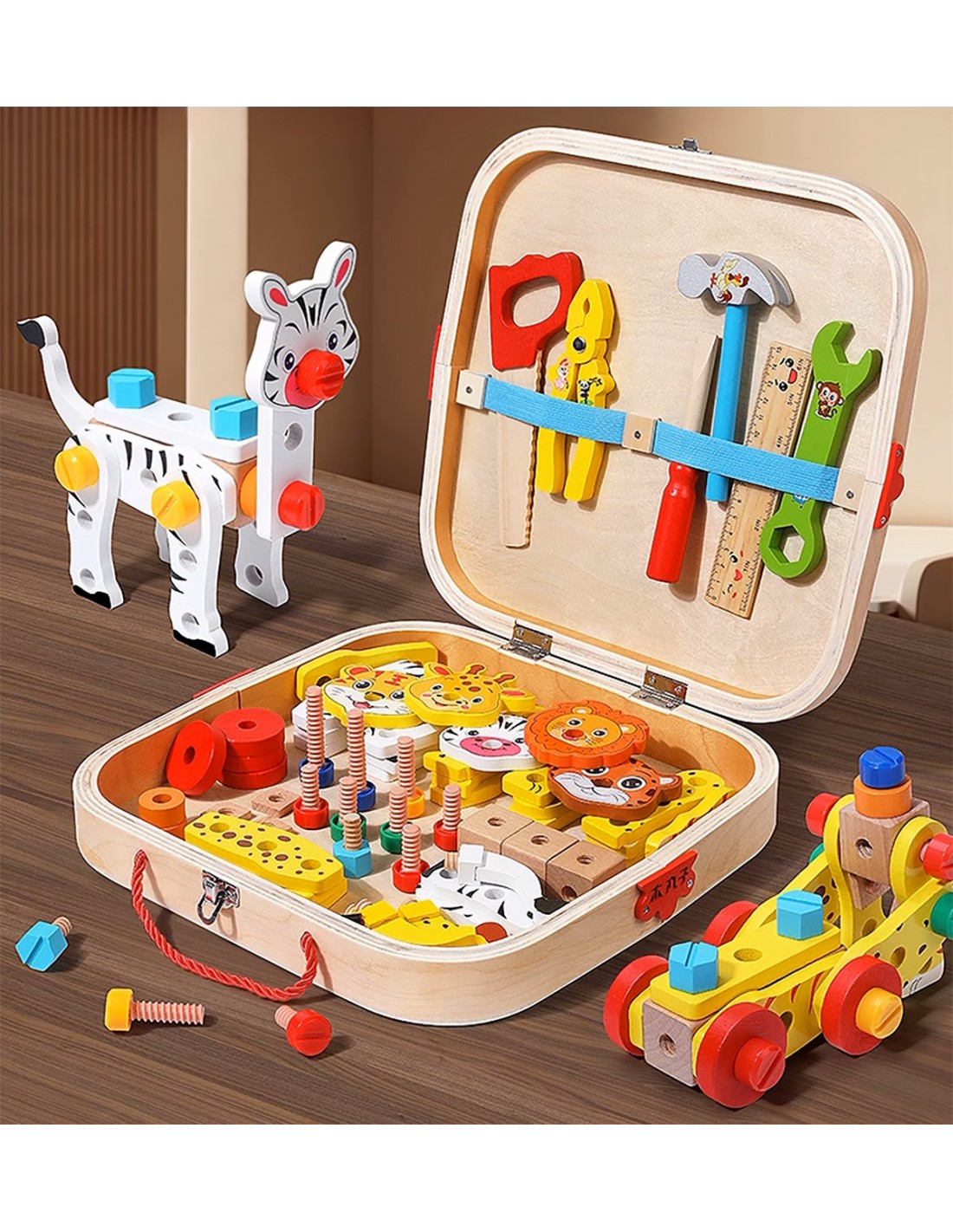 ⭐ZESTAW MAJSTERKOWICZA ZABAWA W WARSZTAT DREWNIANY SKRZYNKA NARZĘDZIA ZWIERZĘTA