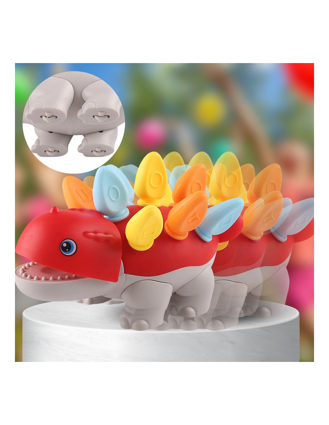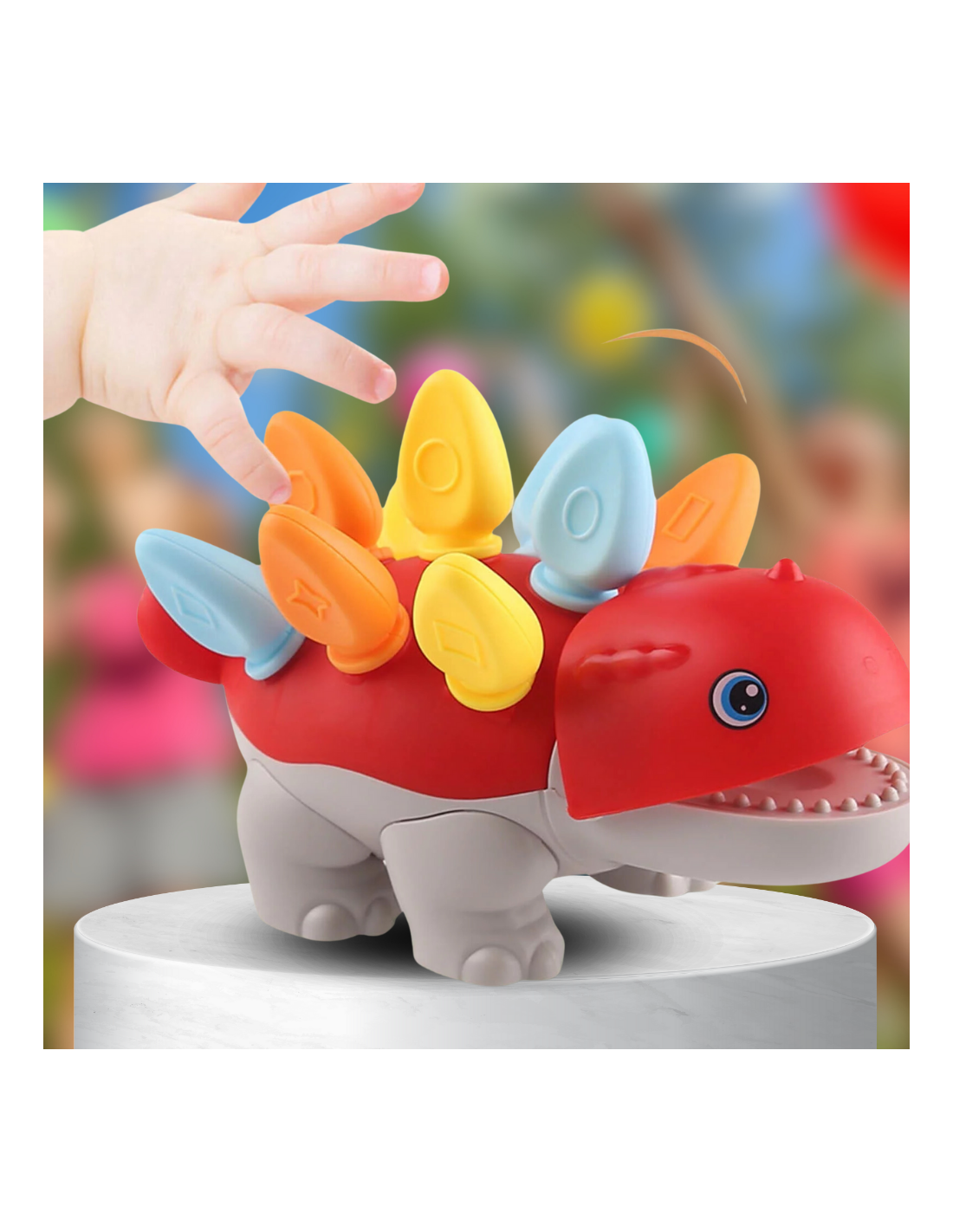 Rozwijaj umiejętności motoryczne za pomocą grubych elementów w kształcie kolców, które pasują do tyłu przyjaznego Ankylozaura. Kolorowe elementy pomagają dziecku rozwijać umiejętności rozpoznawania kolorów, sortowania poprzez gry zręcznościowe.
