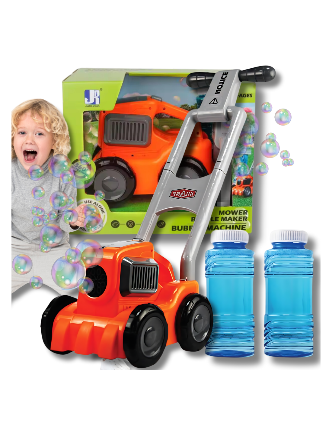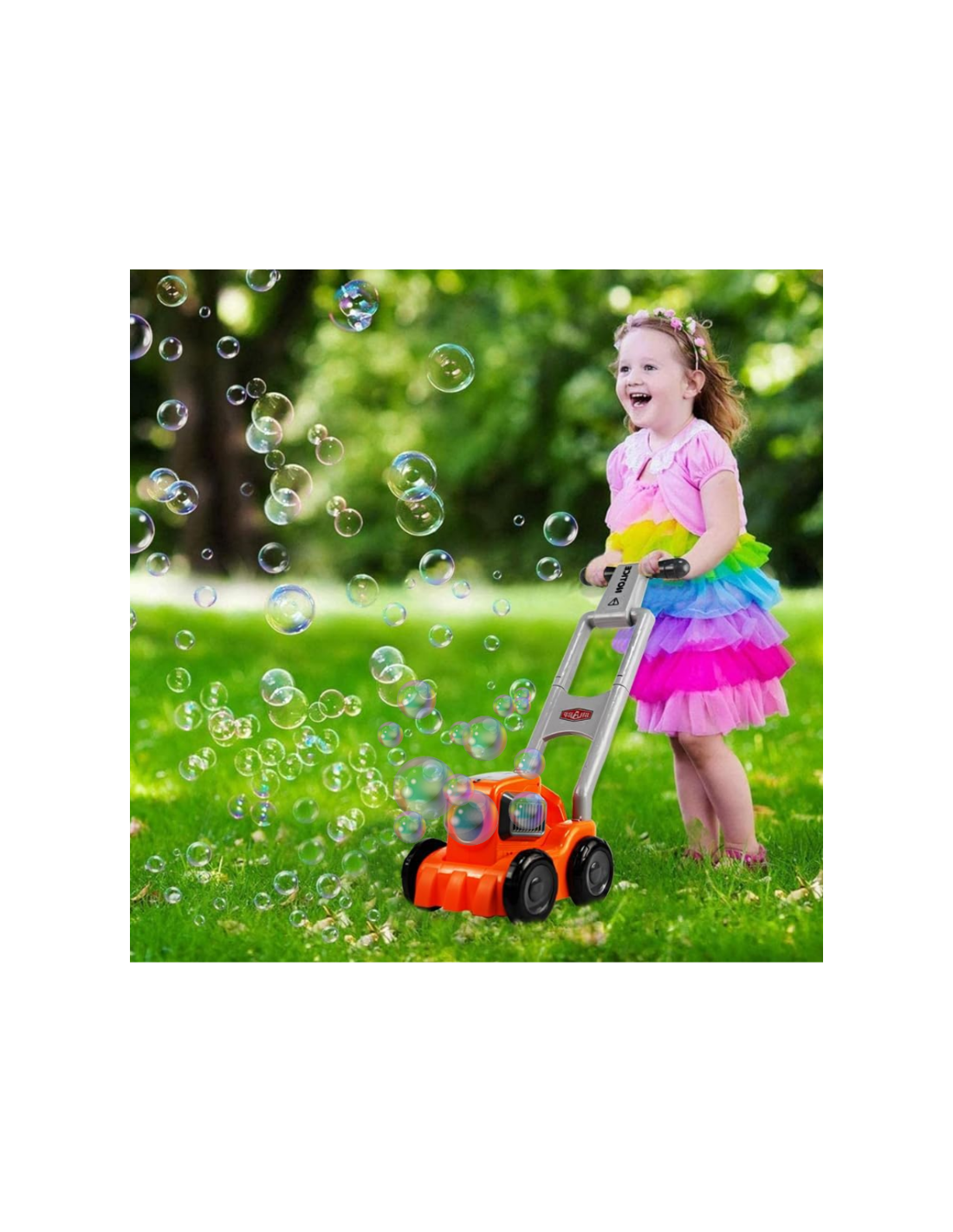 Kosiarka z wbudowanym generatorem baniek mydlanych. Bańki z przedniego wirnika podkaszarki, - podczas koszenia wypuszcza mnóstwo pięknych baniek co daje ogromną frajdę każdemu maluchowi. Płyn uzupełnia się bardzo prosto, wystarczy nalać do zbiornika.