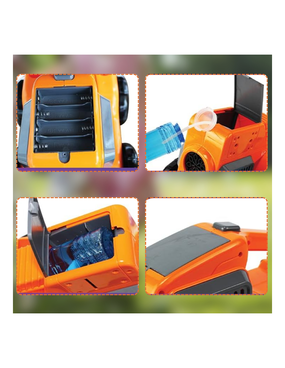 Montaż płynu jest bardzo prosty - końcówkę rurki zasysającej włóż do butelki z płynem tak by dosięgnęła dna a następnie umieść butelkę w zabawce. Wcisnąć guzik I GOTOWE! Z przodu kosiarki wylecą strumienie kolorowych baniek.