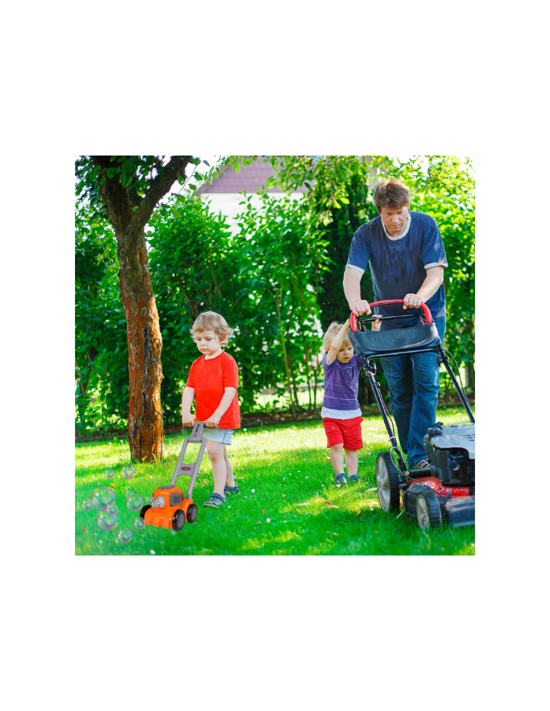 Zabawa w koszenie trawy to jedno z ulubionych zajęć. A jeżeli jeszcze do tego można puszczać bańki? Czego można chcieć więcej? Podkaszarka w dłoń i do dzieła...