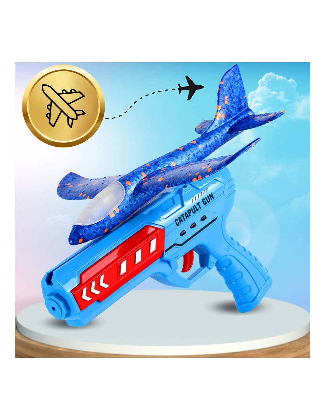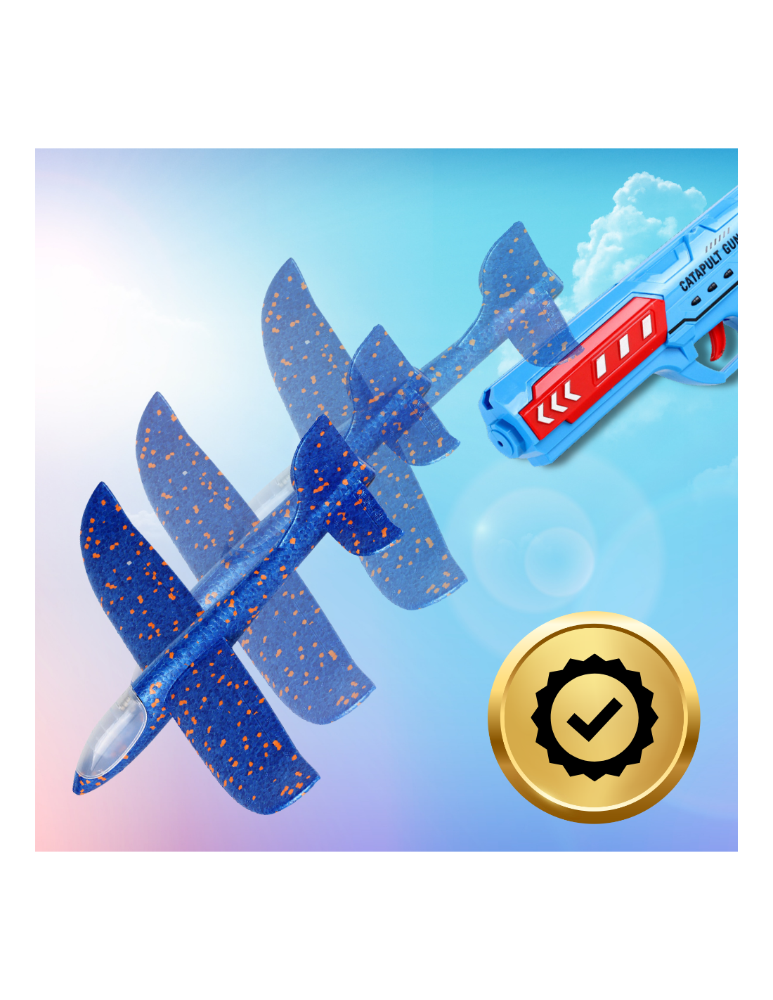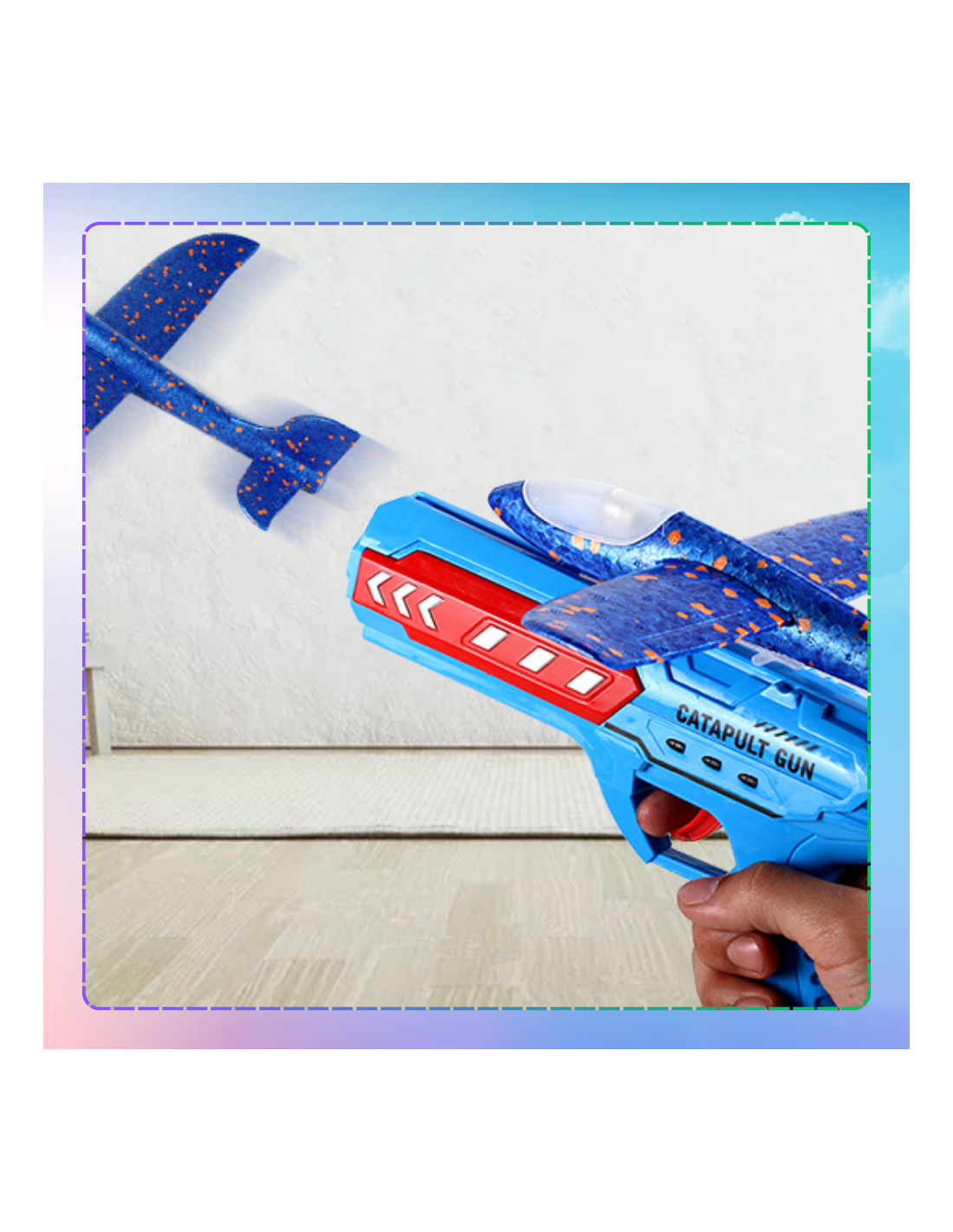 - Spektakularne loty z wyrzutnią – Samolot może być wypuszczany w przestworza za pomocą pistoletu – wyrzutni, załączonej w zestawie. Wystarczy umieścić samolot w odpowiednim miejscu, naciągnąć i strzelić! Dzięki temu poleci zdecydowanie dalej i bardziej spektakularnie niż puszczany z ręki. Pistolet wykonany z mocnego tworzywa sztucznego. ??