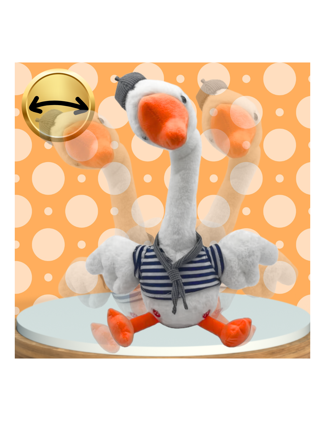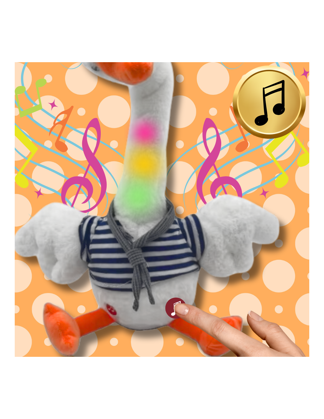 Dodatkowo po naciśnięciu przycisku z ikoną nutki włączą się wesołe piosenki i gęś zacznie tańczyć.