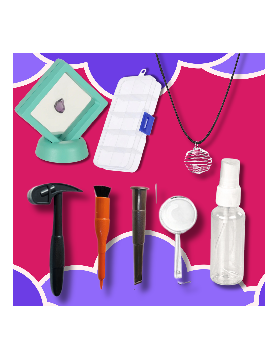 W zestawie znajduje się naszyjnik, w którym dzieci mogą umieścić swoje najcenniejsze znaleziska, aby nosić je zawsze przy sobie.