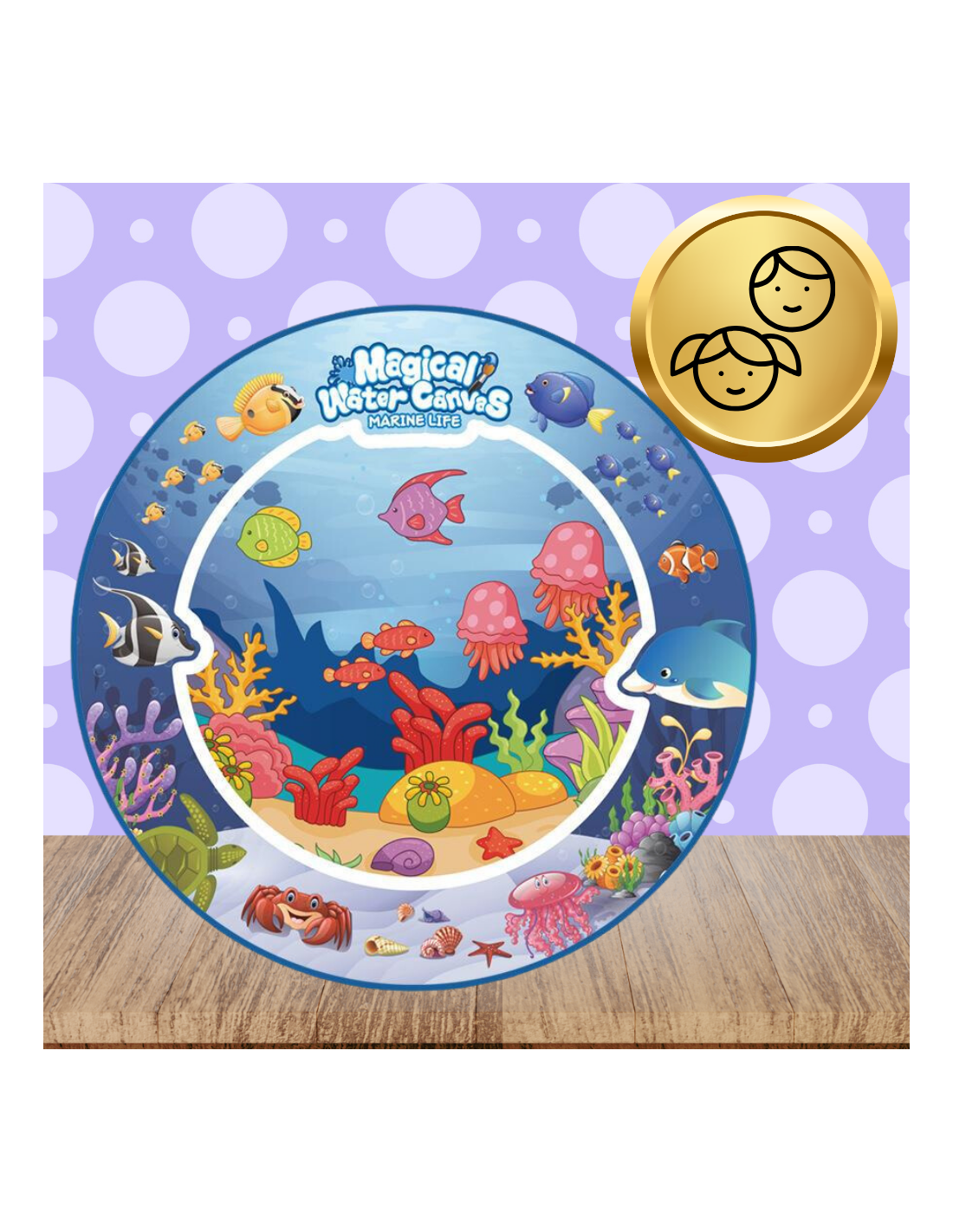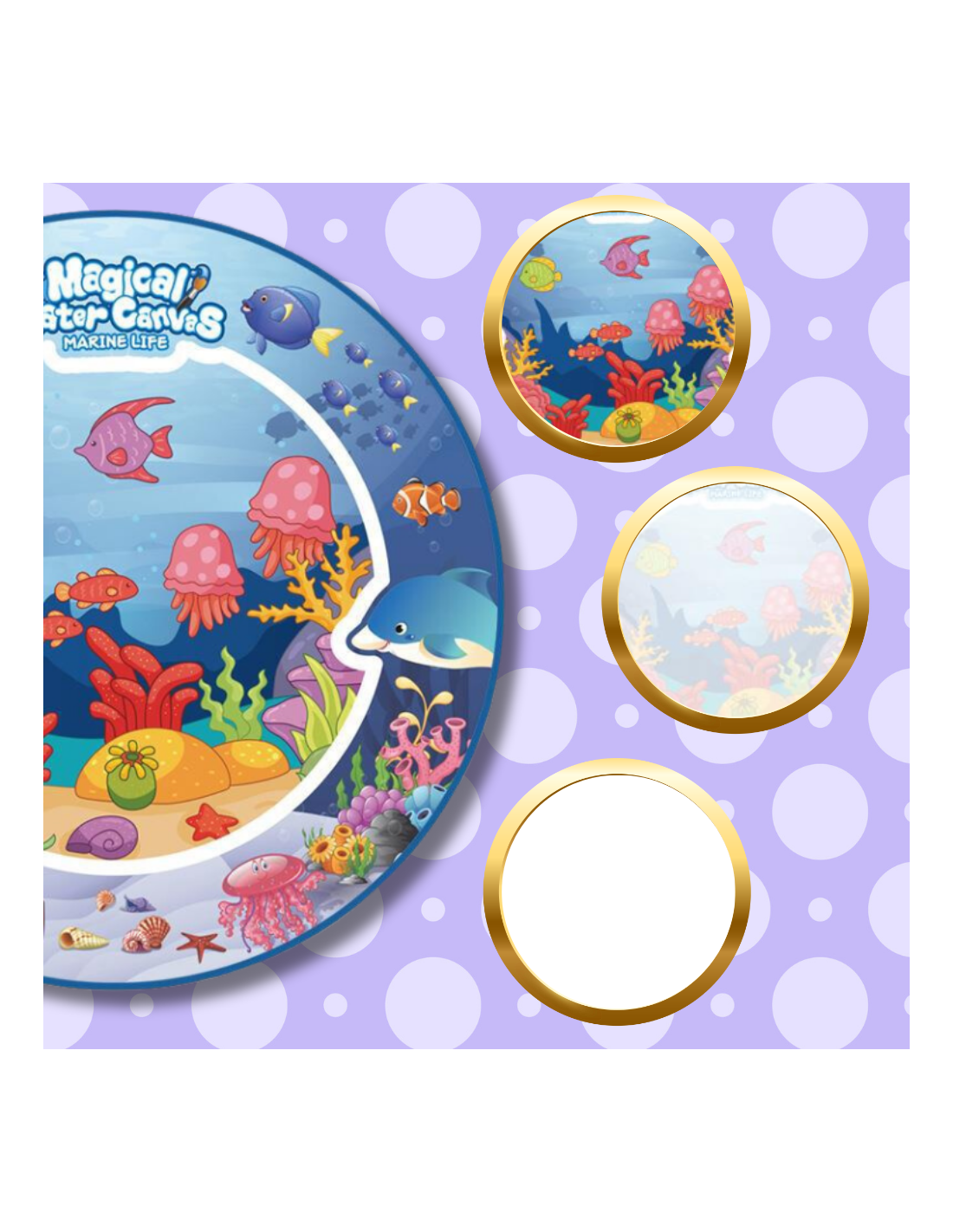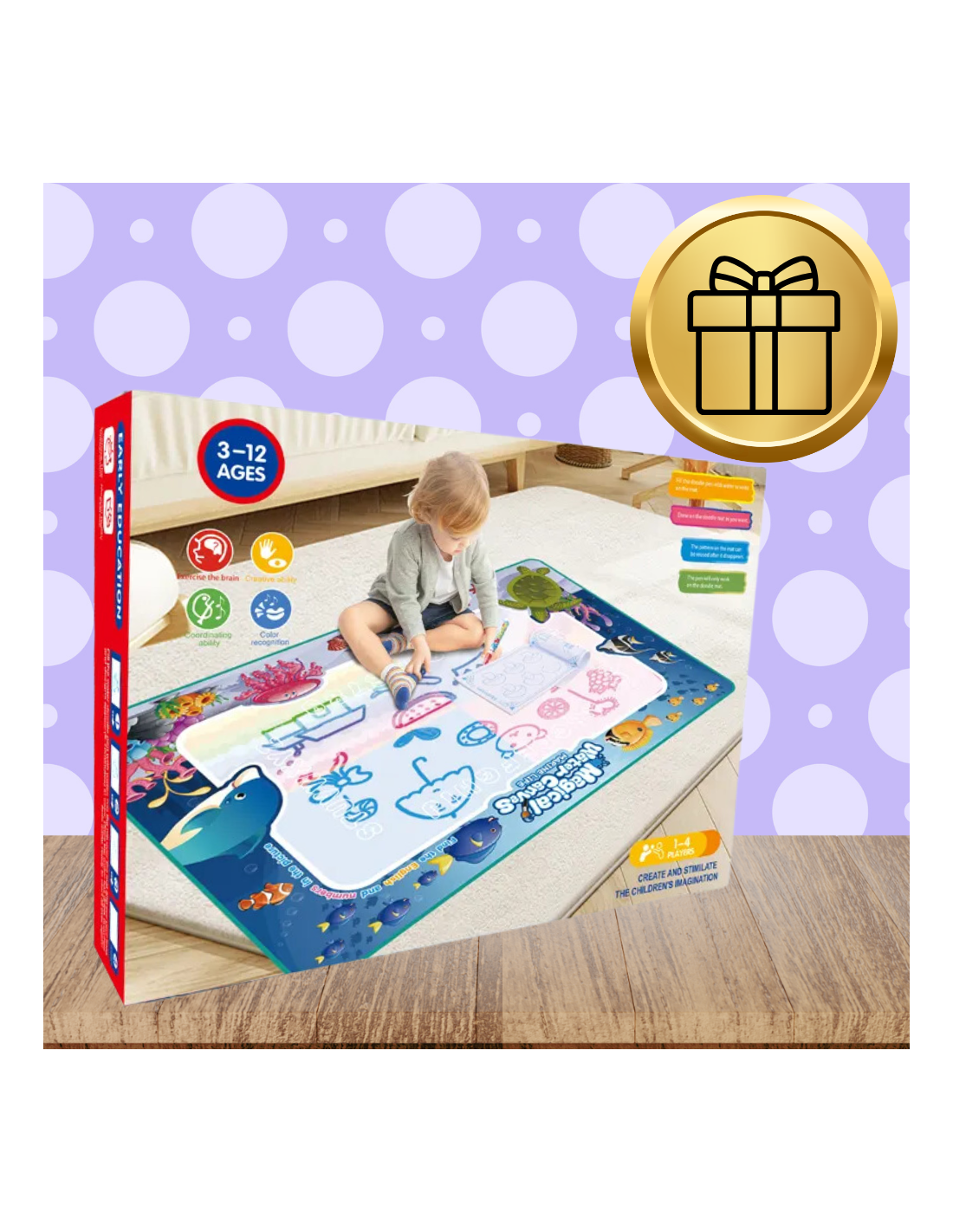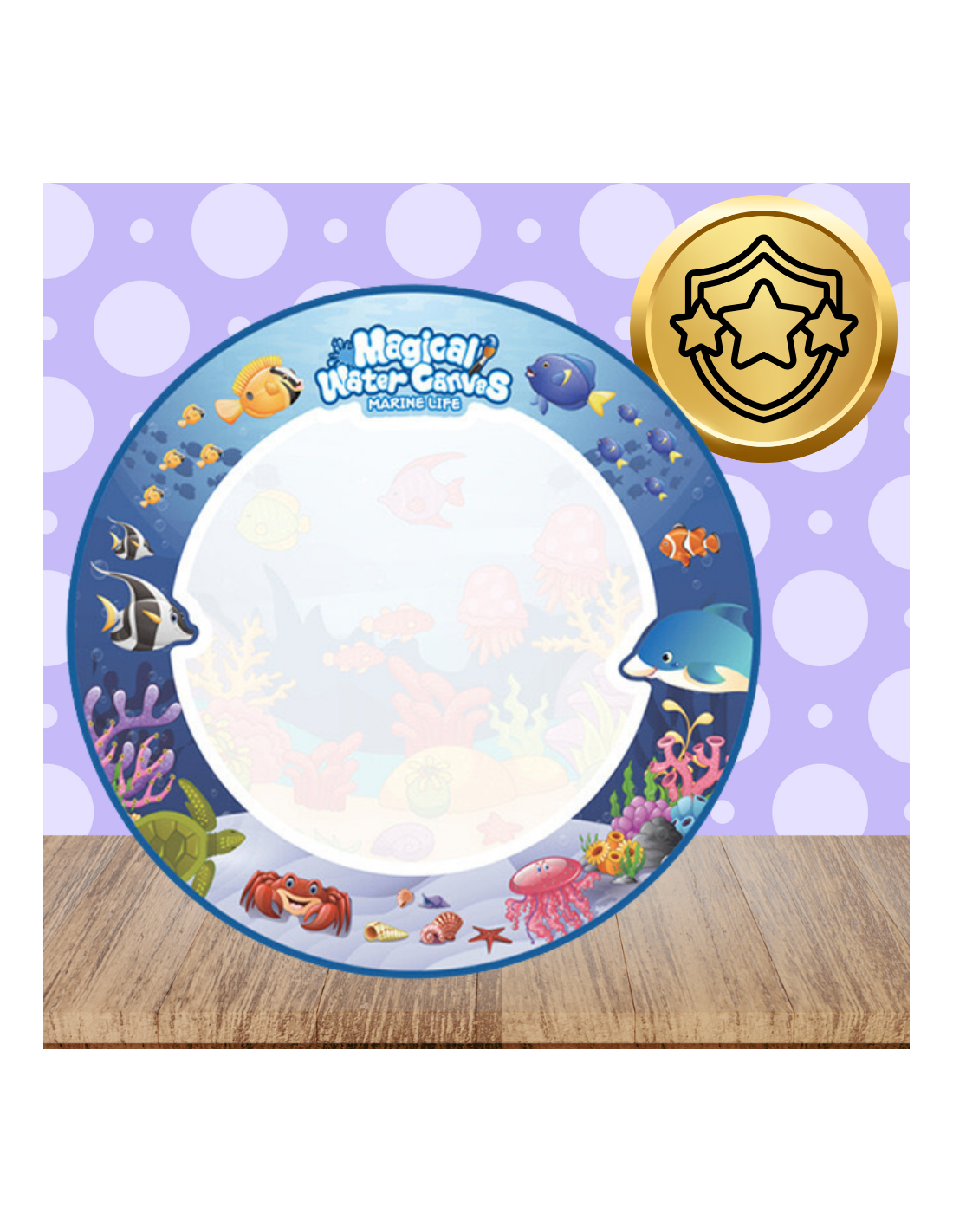 Duża, okrągła mata o średnicy 80 cm z pięknymi motywami podwodnego świata, takimi jak ryby, koralowce i inne morskie stworzenia. Powierzchnia maty pozwala dzieciom malować i rysować przy użyciu samej wody, a po wyschnięciu wzory znikają, umożliwiając wielokrotne użycie.