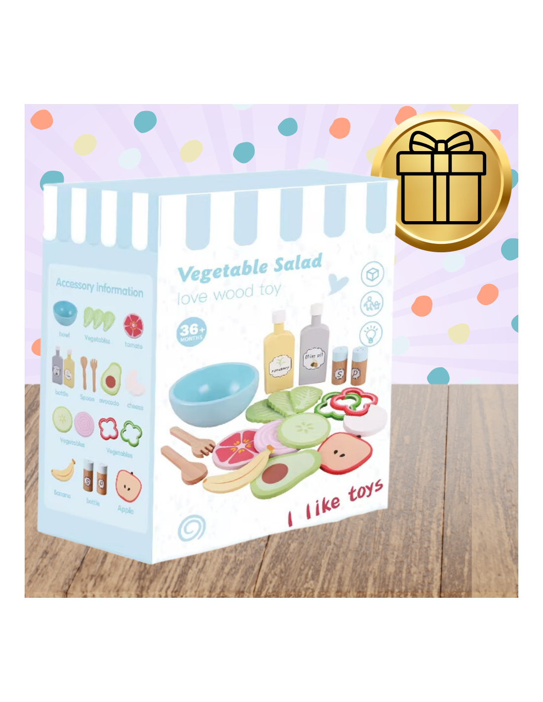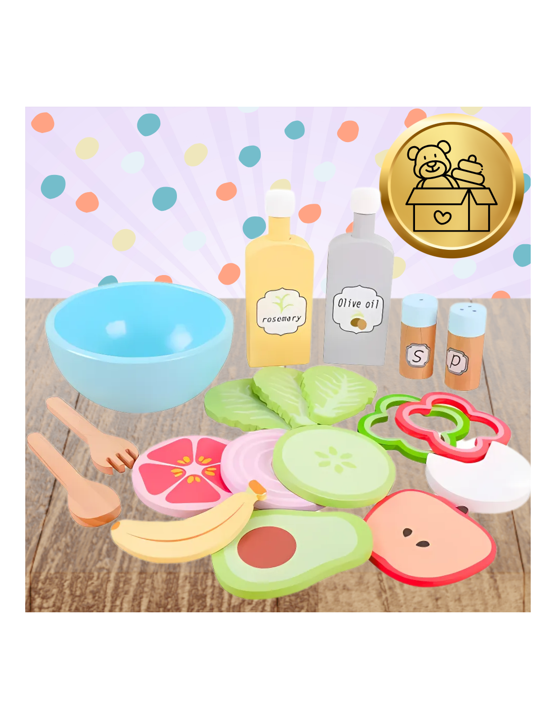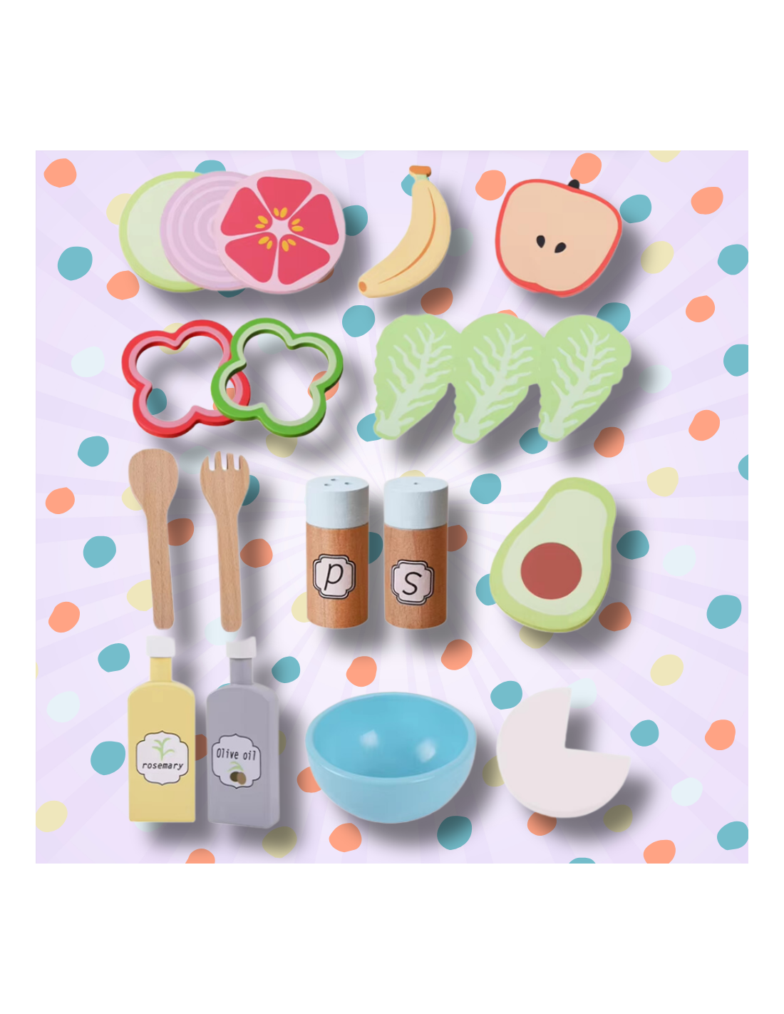 1️⃣Drewniane warzywa i owoce oraz ser – Zestaw zawiera różne kolorowe warzywa i owoce, takie jak jabłko, papryka, sałata i wiele innych, które można serwować podczas zabawy.
