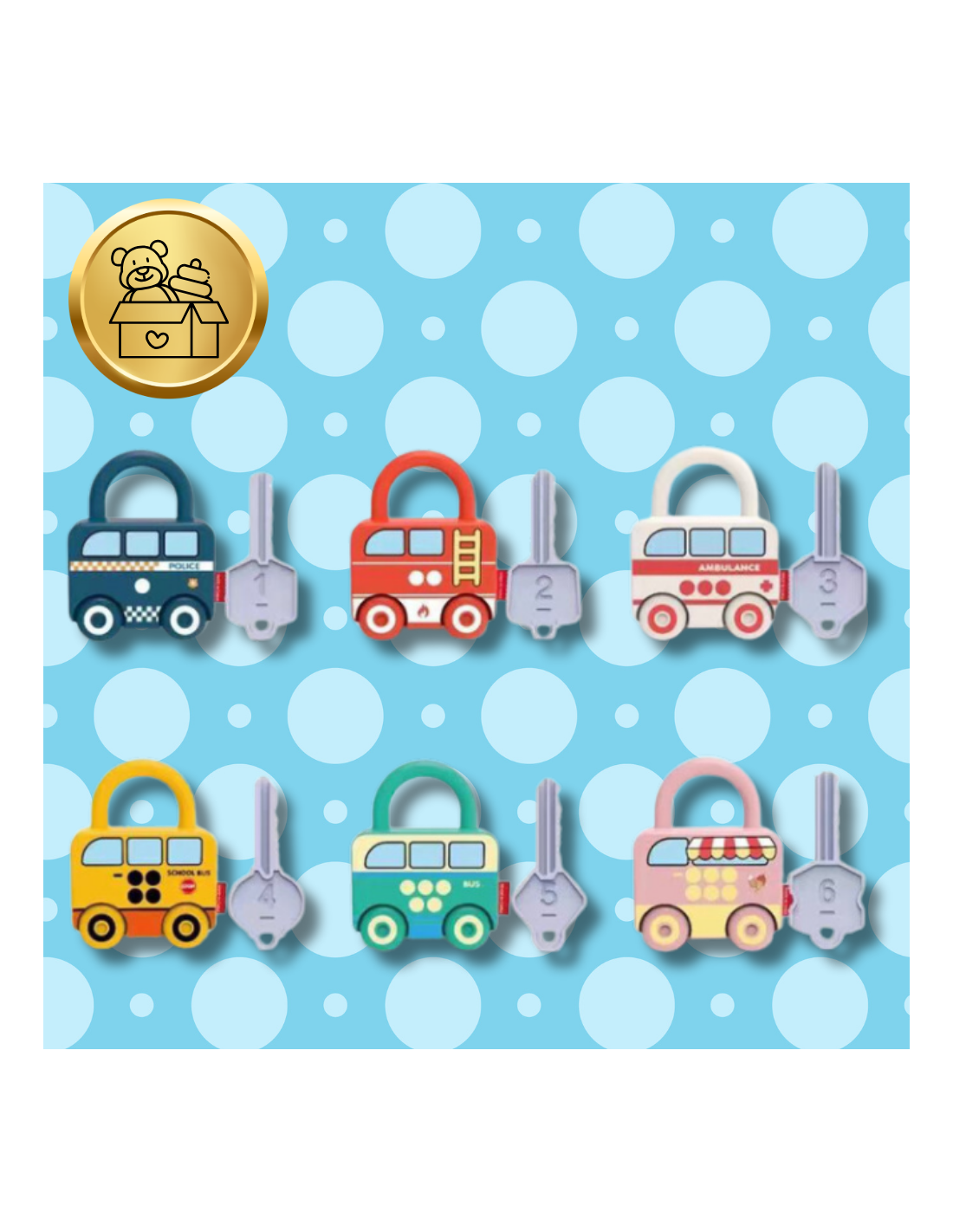Do każdego samochodu dołączony jest kluczyk, który dziecko musi dopasować, aby odblokować kłódkę. Kluczyki są różnej wielkości, co wprowadza dodatkowy element wyzwania.