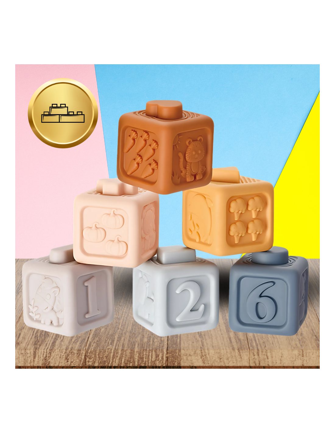 - 6 szt sześciennych klocków z cyferkami i wypustkami ( tylko jeden klocek pasuje do następnego, dziecko uczy się spostrzegawczości) wymiar jednego klocka ok 5 cm x 5 cm