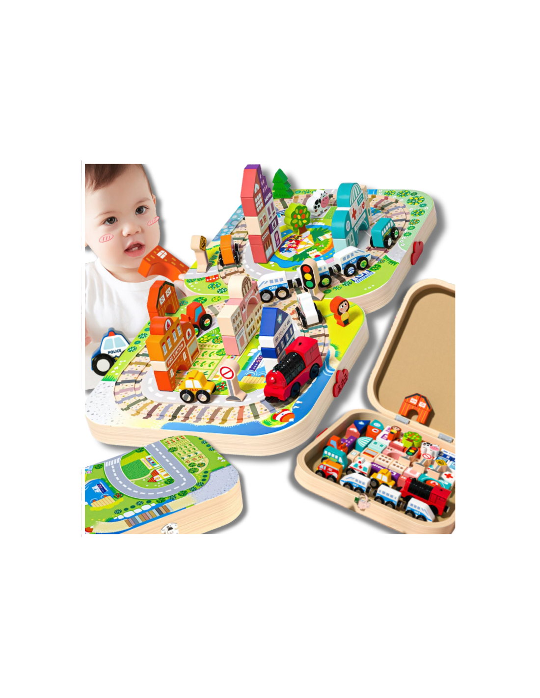 Drewniana Skrzynka dla Dzieci – Rozkładane Miasteczko z Lokomotywą i Dodatkami!✅