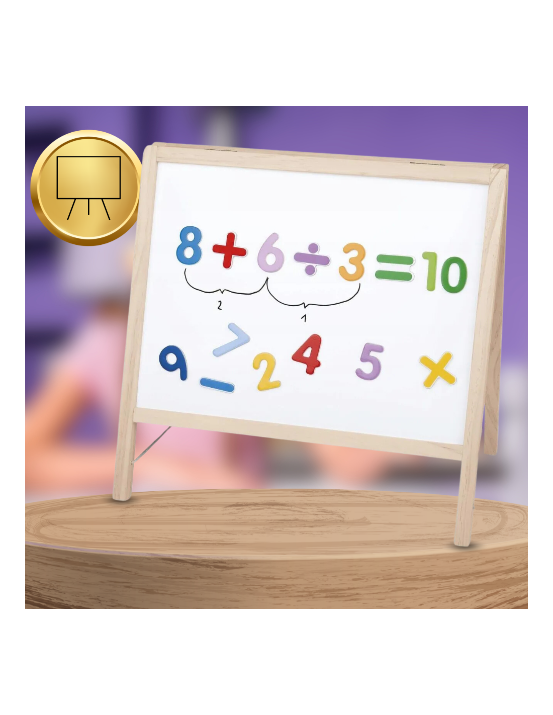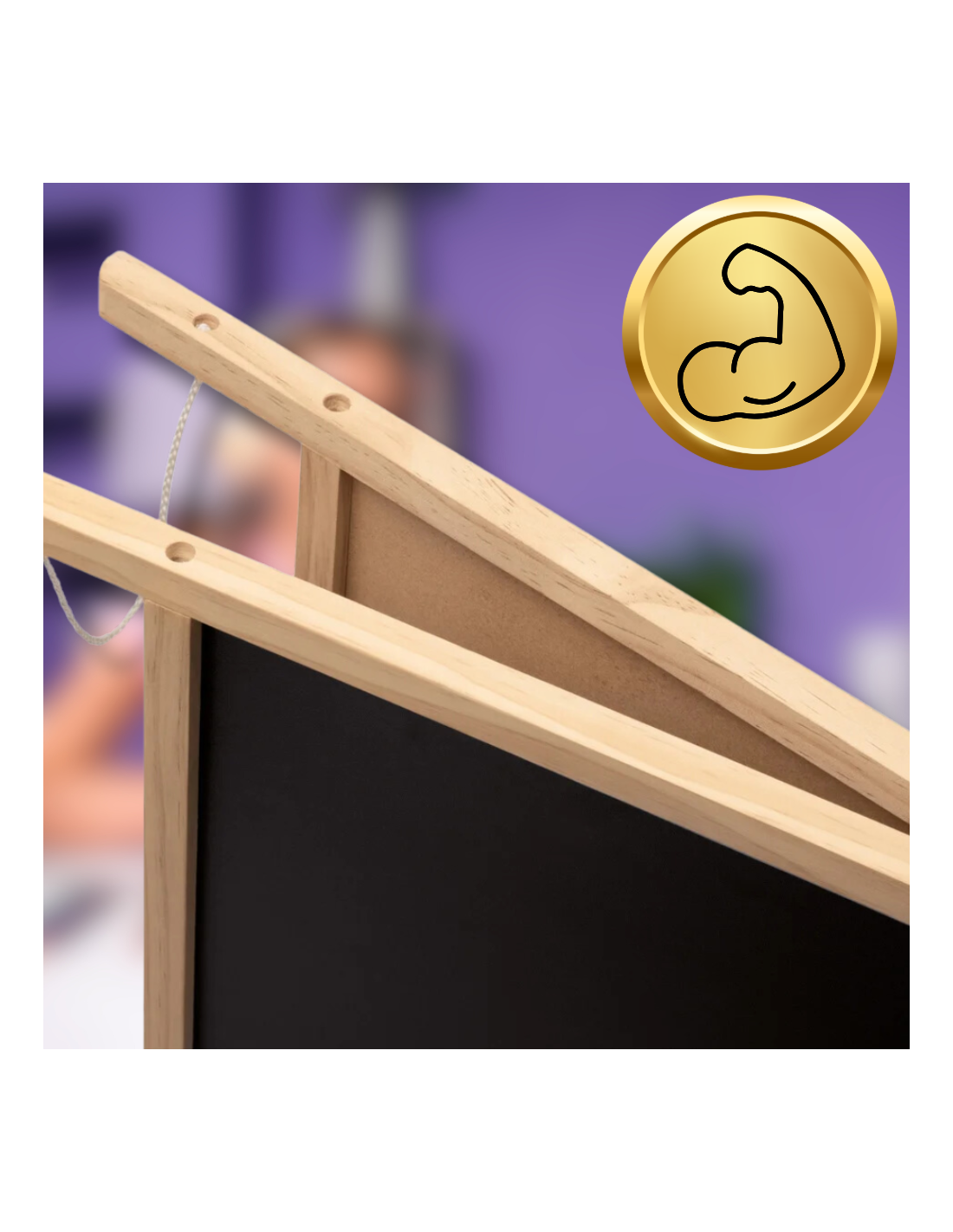 Tablica posiada solidną i estetyczną ramę wykonaną z naturalnego drewna, która zapewnia trwałość oraz stabilność całej konstrukcji. Drewniana rama nadaje tablicy elegancki wygląd, a jednocześnie jest przyjazna dla środowiska, co czyni ją idealnym wyborem do dziecięcego pokoju.