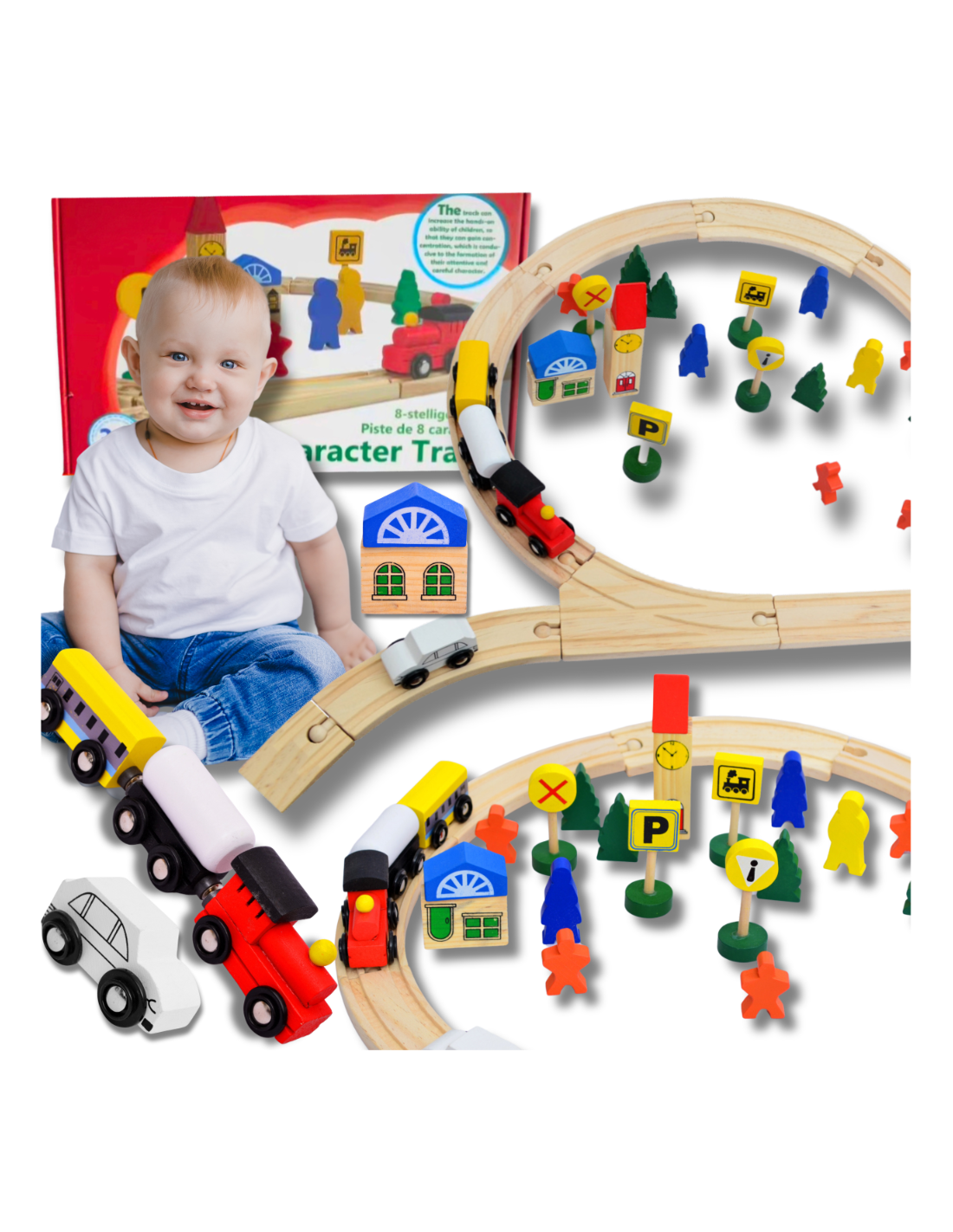 ⭐ DREWNIANA KOLEJKA TOR POCIAG 48 el. MIASTO ZNAKI POCIĄG NA MAGNES TORY 240cm