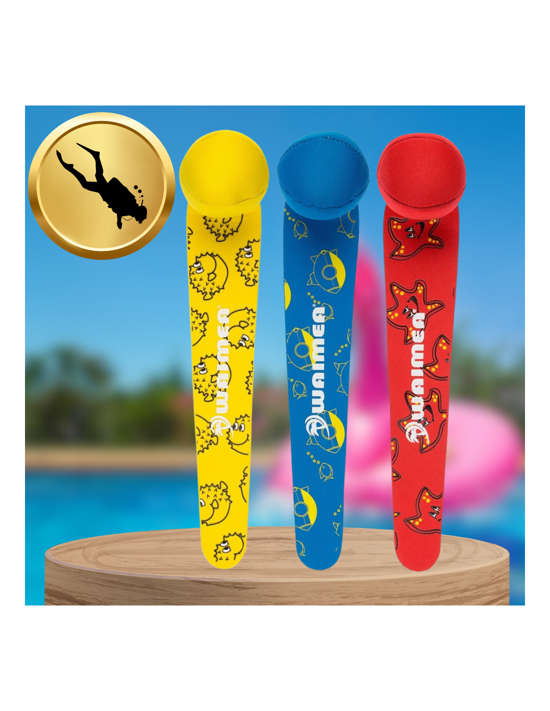 ✅Zestaw trzech piłeczek z uchwytem neoprenowych WAIMEA to idealna zabawka do nauki pływania i nurkowania. Wypełnione piaskiem, pałeczki szybko opadają na dno, co sprawia, że dzieci mają szansę na świetną zabawę w wodzie, ucząc się przy tym techniki nurkowania. Kolorowe pałeczki w zestawie o różnych barwach to doskonały wybór dla maluchów, które chcą rozwinąć swoje umiejętności wodne.