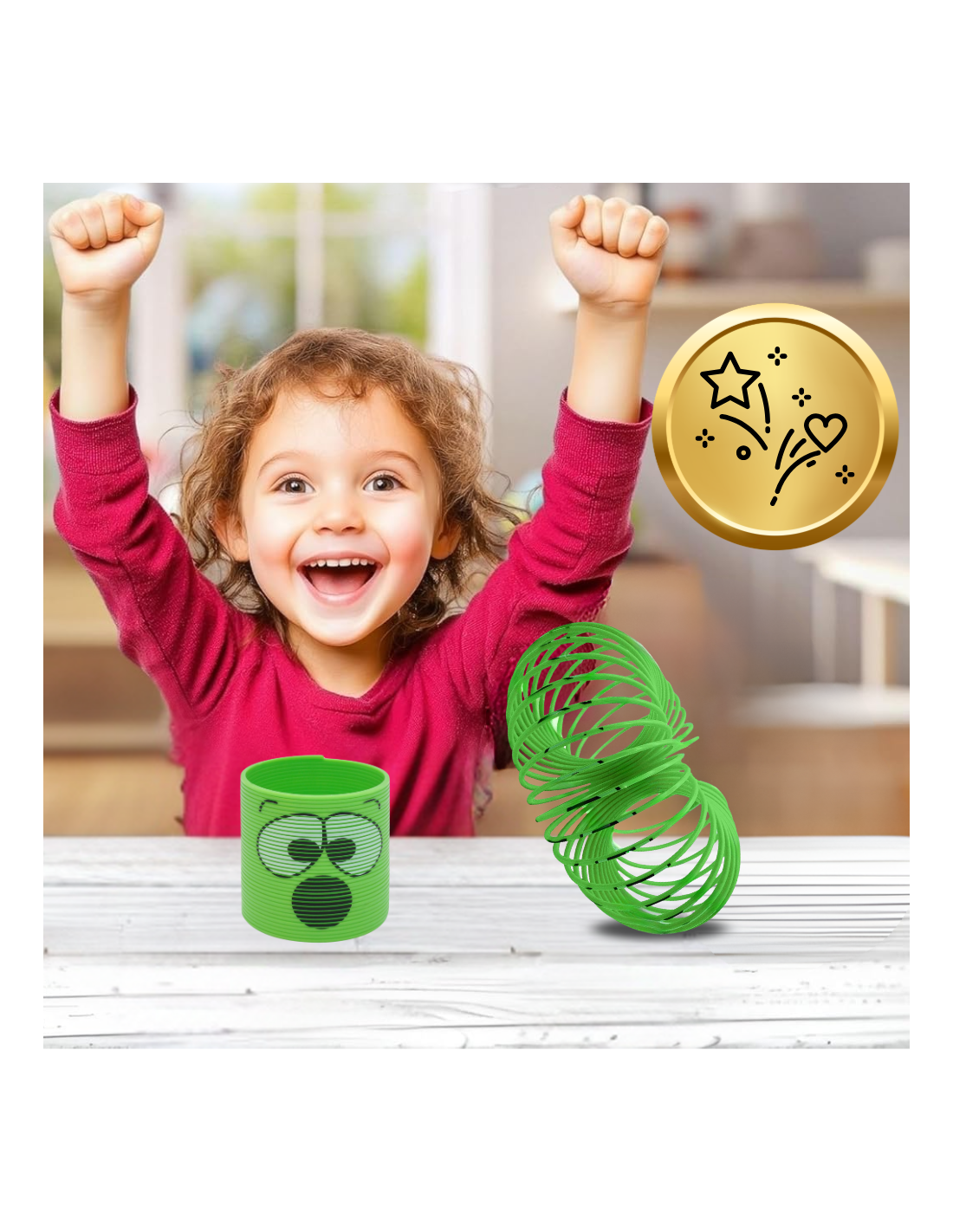 Odkryj magię zabawy z naszą dziecięcą sprężyną Magiczną Spręźką w zielonym kolorze! Ta nietypowa zabawka, zdobiona wzorami emoji, dostarczy Twojemu dziecku godzin radości i kreatywnej zabawy. Dzięki unikalnej konstrukcji, sprężynka porusza się w niezwykły sposób, co sprawia, że jest doskonałym dodatkiem do każdego zestawu zabawek. Jest lekka, łatwa do przenoszenia, a jej solidne wykonanie zapewnia długotrwałe użytkowanie. Idealna do zabawy zarówno w domu, jak i na świeżym powietrzu, a także świetna na prezent. Sprężynka rozwija zdolności motoryczne oraz pobudza wyobraźnię dzieci. Spraw swojemu dziecku niezapomniane chwile pełne radości i odkryć!