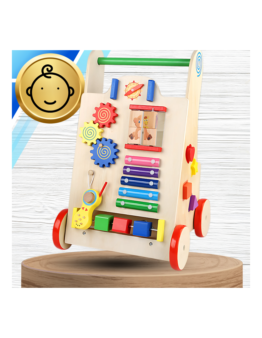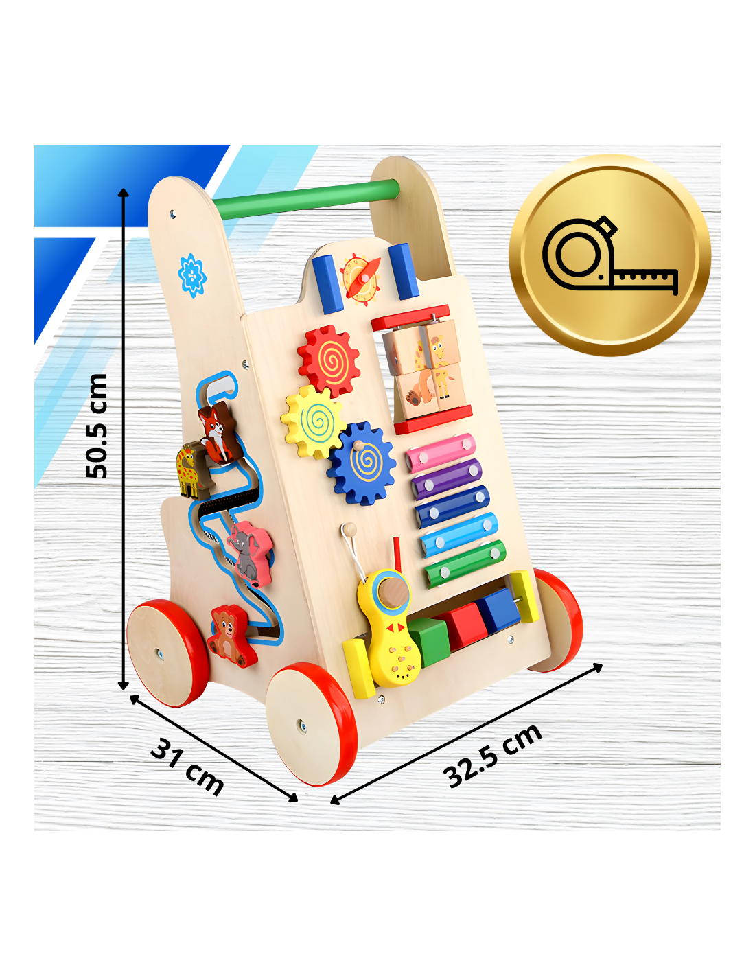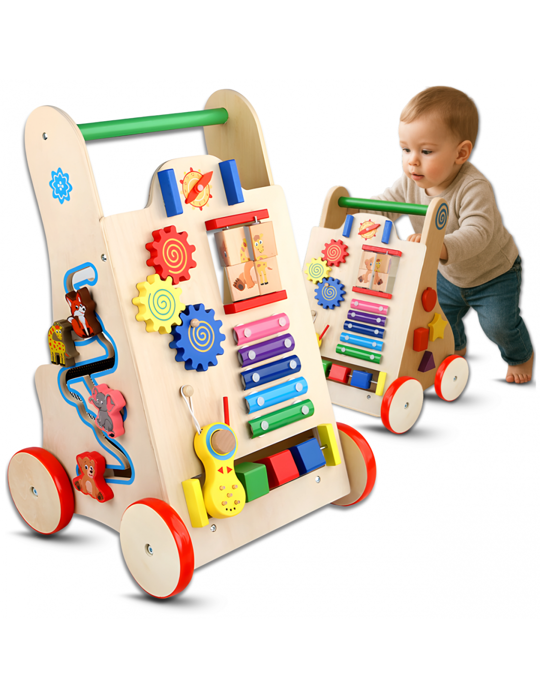 Ten kolorowy pchacz edukacyjny z drewna to idealna zabawka dla maluchów, które stawiają swoje pierwsze kroki. Solidna konstrukcja zapewnia bezpieczeństwo, a liczne funkcje edukacyjne rozwijają zdolności manualne, poznawcze i muzyczne dziecka.