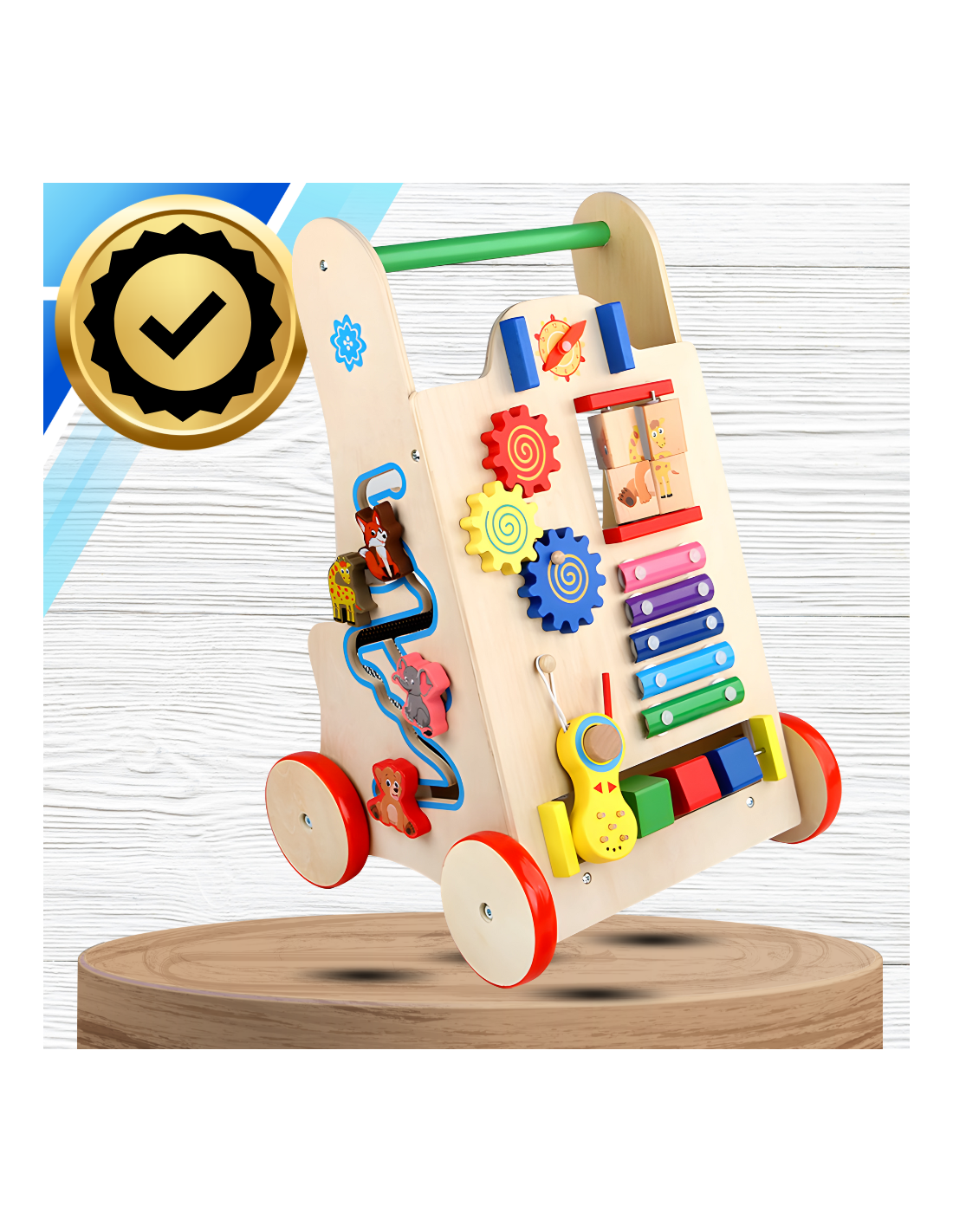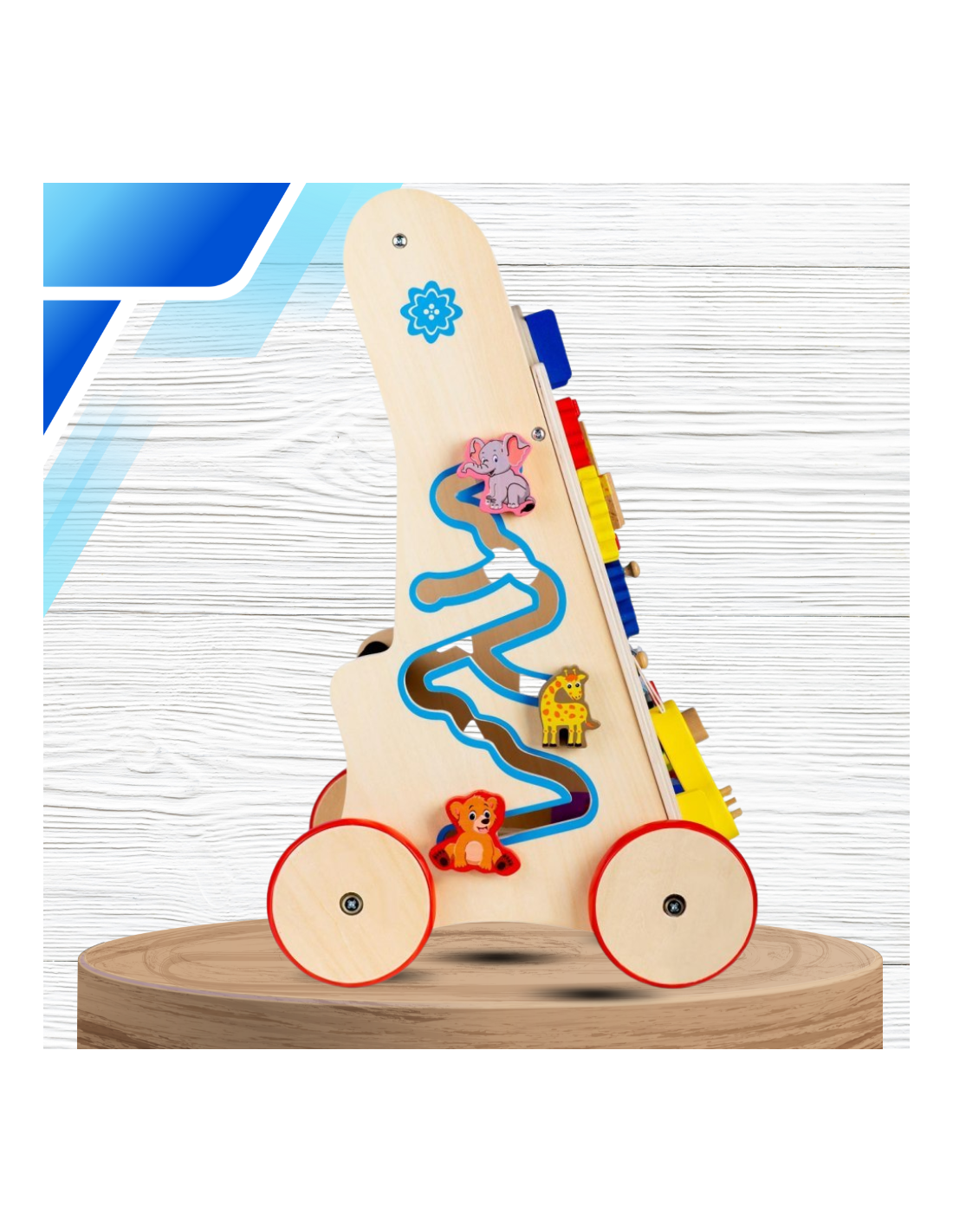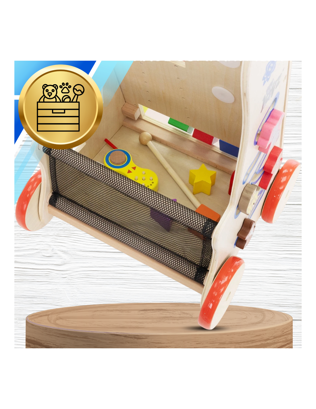 Ten kolorowy pchacz edukacyjny z drewna to idealna zabawka dla maluchów, które stawiają swoje pierwsze kroki. Solidna konstrukcja zapewnia bezpieczeństwo, a liczne funkcje edukacyjne rozwijają zdolności manualne, poznawcze i muzyczne dziecka.