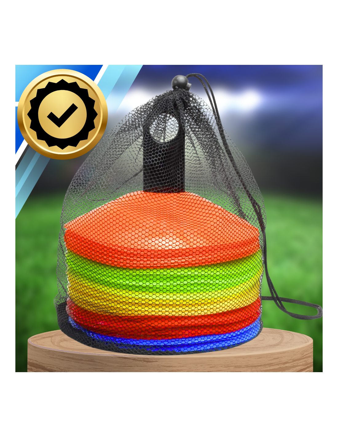 Zestaw 50 znaczników treningowych pachołki dyski + stojak + siatka | Kolorowe mini pachołki do piłki nożnej