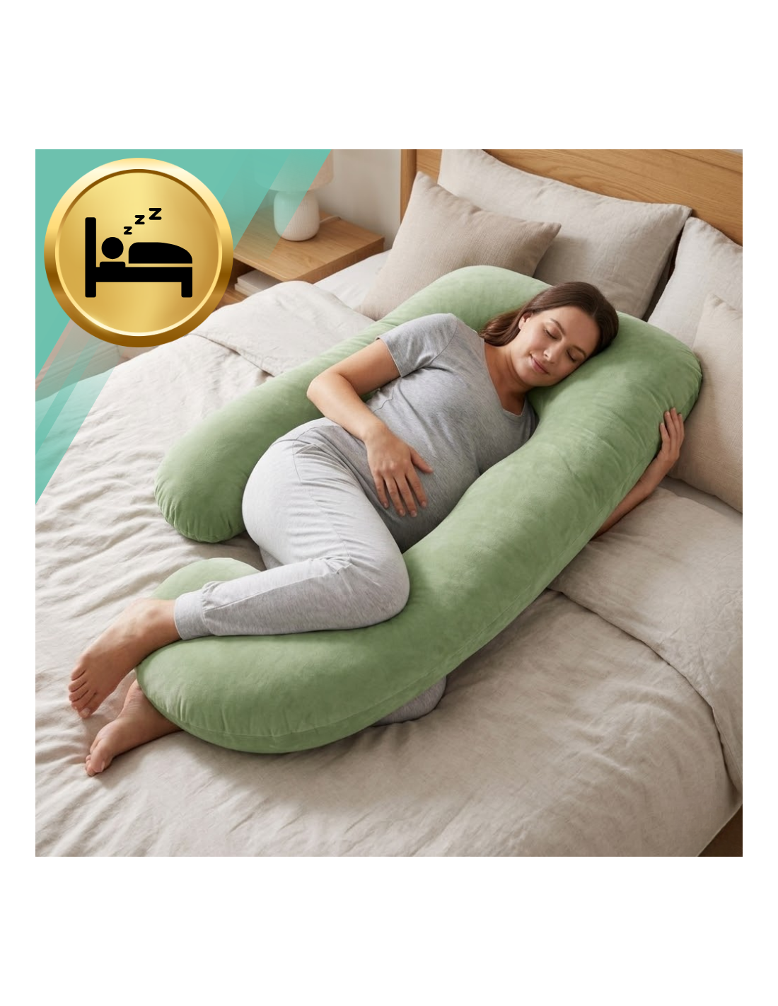 Pomaga złagodzić typowe dolegliwości podczas ciąży, takie jak ból pleców, ucisk w stawach biodrowych i stawowych oraz obrzęki. Spanie z tą poduszką poprawia krążenie krwi i sprzyja prawidłowemu ułożeniu kręgosłupa, pomagając obudzić się wypoczętym i pełnym energii.