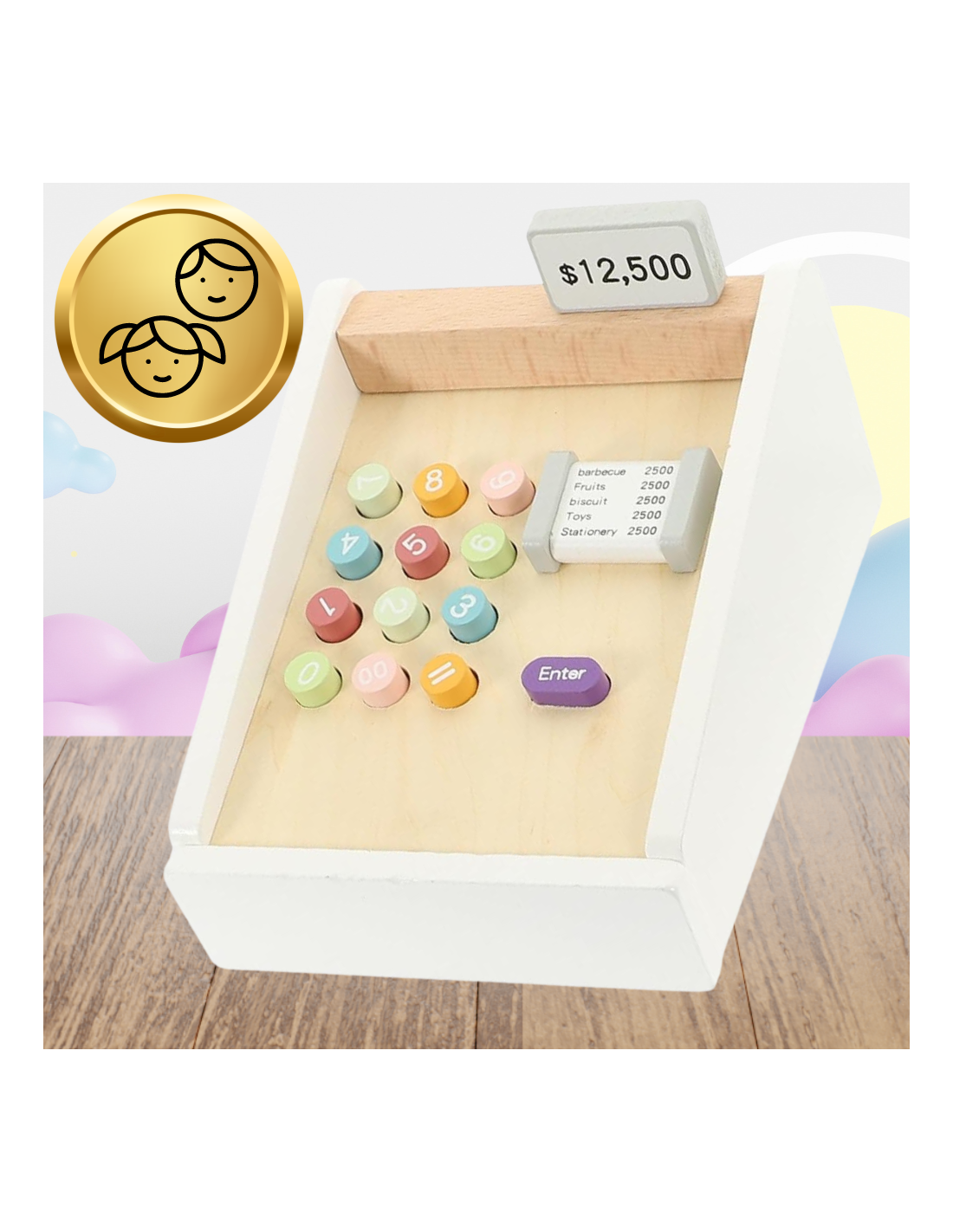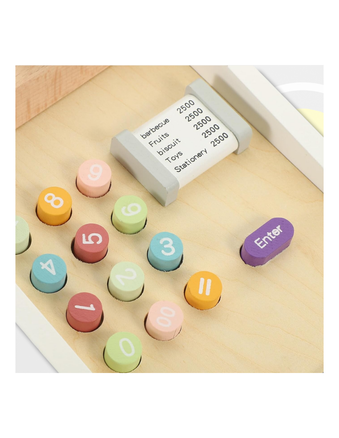 1️⃣Drewniana kasa fiskalna – Pięknie wykonana, klasyczna kasa z ruchomymi przyciskami, otwieraną szufladą na pieniądze. Solidna konstrukcja z drewna gwarantuje trwałość i bezpieczeństwo podczas zabawy.