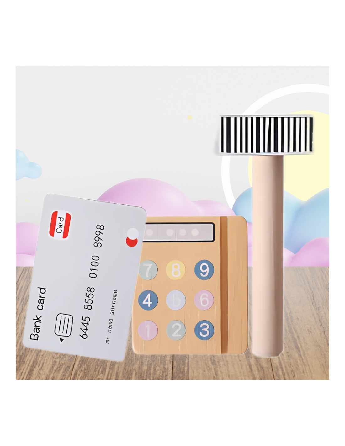 3️⃣Karta płatnicza i czytnik kart – Nowoczesny element zestawu! Dzięki karcie i czytnikowi dzieci mogą uczyć się, jak korzystać z płatności bezgotówkowych, co pozwala na bardziej realistyczne odwzorowanie codziennych sytuacji zakupowych.