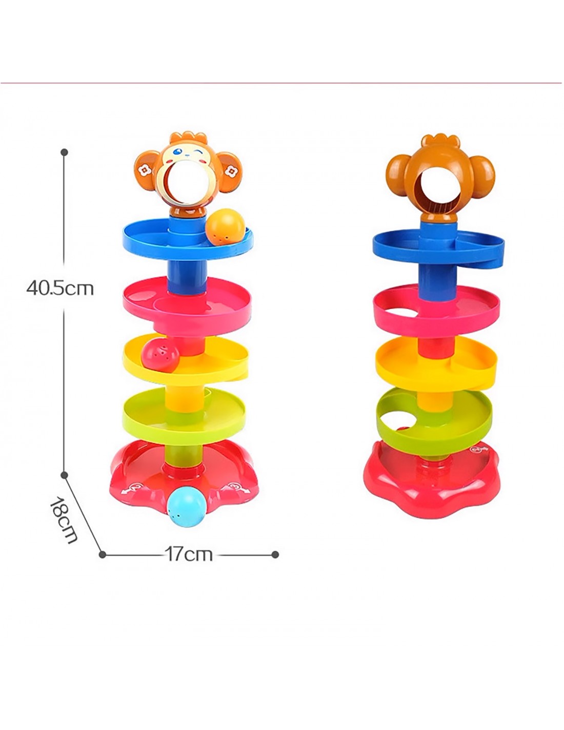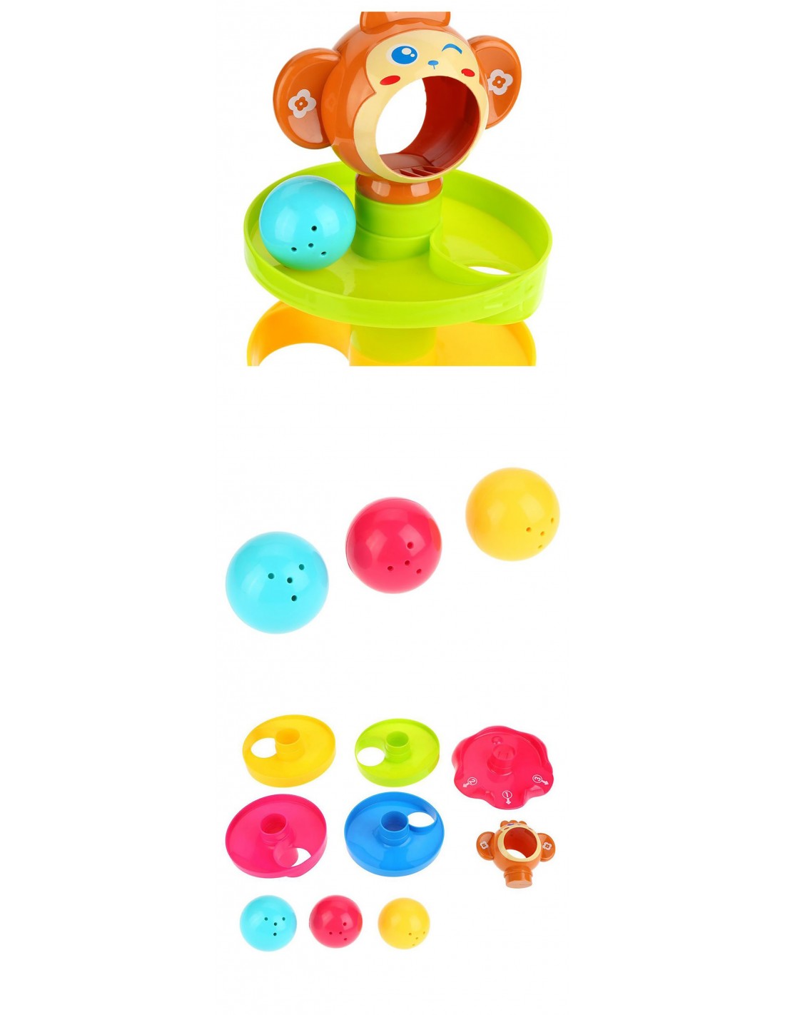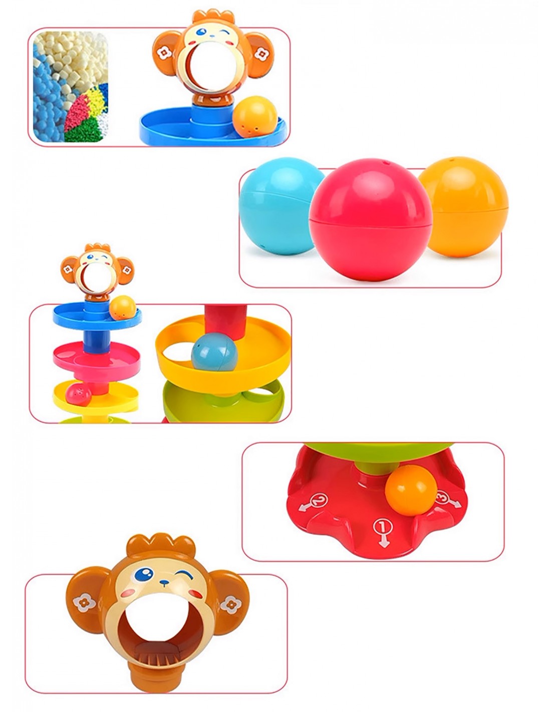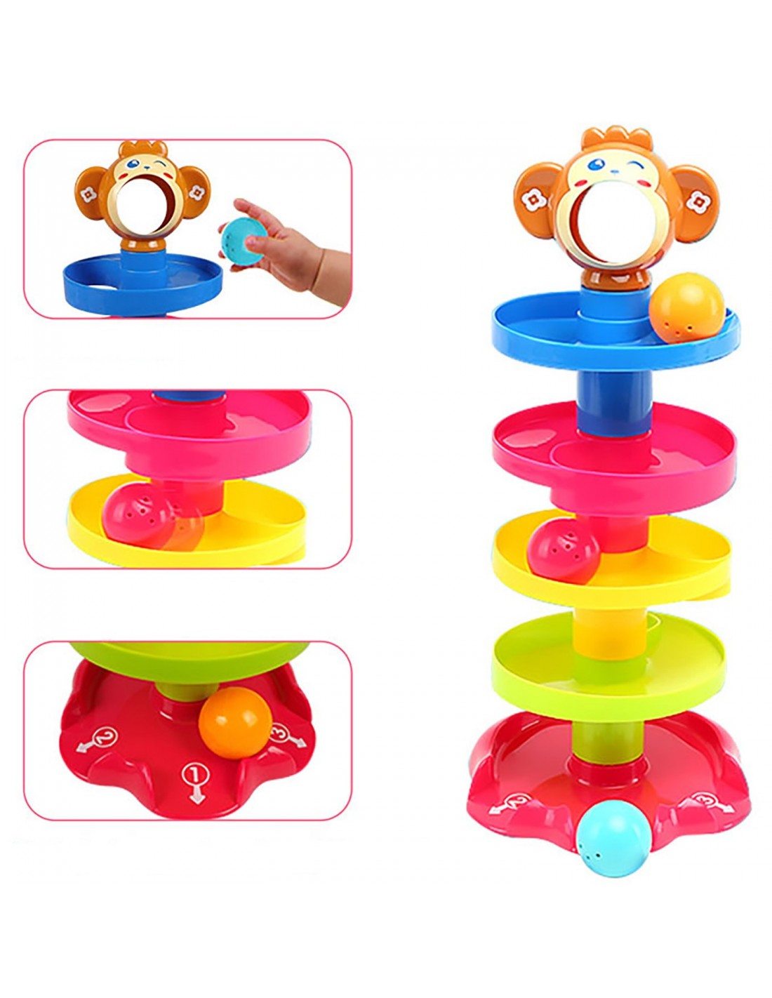 Zjeżdżalnia Wieża z Piłeczkami to kreatywna forma zabawy dla maluchów. Dziecko może chwycić jedną z trzech kolorowych i grzechoczących piłeczek, a następnie wrzucić ją do buzi małpki. Piłeczka toczy się w dół wieży i wypada jednym z trzech wyjść. Które wyjście zostanie wybrane tym razem? Niespodzianka!