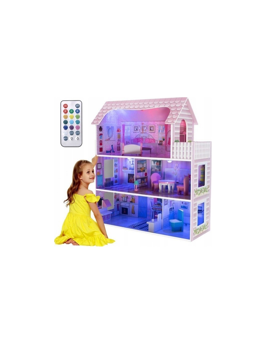 Super prezent dla każdej dziewczynki Wyjątkowy, wykonany z drewna domek dla lalek, doskonały na wielogodzinną zabawę dla każdej dziewczynki i jej koleżanek. Domek idealnie nadaje się dla lalek, które w tej rezydencji będą czuły się jak w pałacu. Produkt wykonany został nie tylko z dbałością o precyzję wykonania, ale również bezpieczeństwo zabawy dziecka, co potwierdzają certyfikacje. W ZESTAWIE ZNAJDUJE SIĘ 8 KOLOROWYCH MEBELKÓW: stolik i 2 krzesła kołyska 2 regały kuchenne z otwieranymi szafkami w kuchni, toaleta w łazience, lampa, Domek zawiera oświetlenie LED . 5 punktów świecących pilot zdalnego sterowania zmieniający kolory oświetlenia 13 różnych kolorów do ustawienia światełka LED można umocować w dowolnym miejscu Domek firmy HH Poland do samodzielnego montażu. Uwaga: Oświetlenie jest z dedykowanym pilotem. (Nie jest to listwa świecąca bez pilota) Wymiary domku: wysokość całkowita: 70 cm, długość: 60 cm, szerokość: 23,5 cm Wymiary opakowania: 62 cm x 25 cm x 13 cm Waga produktu: 8 kg Produkt przeznaczony dla dzieci od 3 roku życia. Domek zapakowany bardzo starannie ładnym kolorowym pudełkiem. Idealny na prezent. Produkt do samodzielnego montażu.