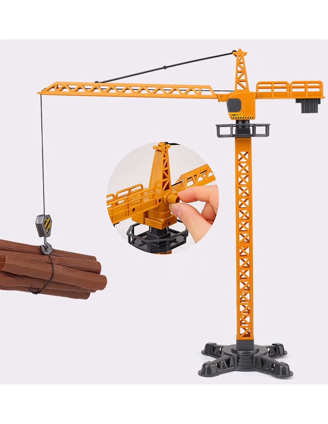 Dźwig posiada ruchome lementy. Za pomocą gałki można podnosić oraz obniżać hak, można także kręcić dźwigiem.