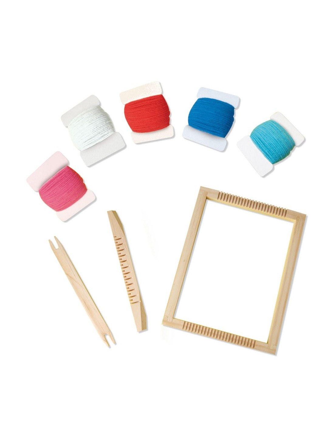 Drewniane krosno tkackie przeznaczone jest dla dzieci, które chcą zapoznać się z techniką tkania. Krosno ma solidną drewnianą konstrukcję o wymiarach 15 x 20 cm. W zestawie znajduje się: drewniane krosno, grzebień do przeczesywania oraz patyczek do przeplatania, kolorowe włóczki, kolorowa instrukcja obrazkowa. Zabawka odpowiednia dla dzieci od 6 lat. Wyprodukowano w Holandii.
