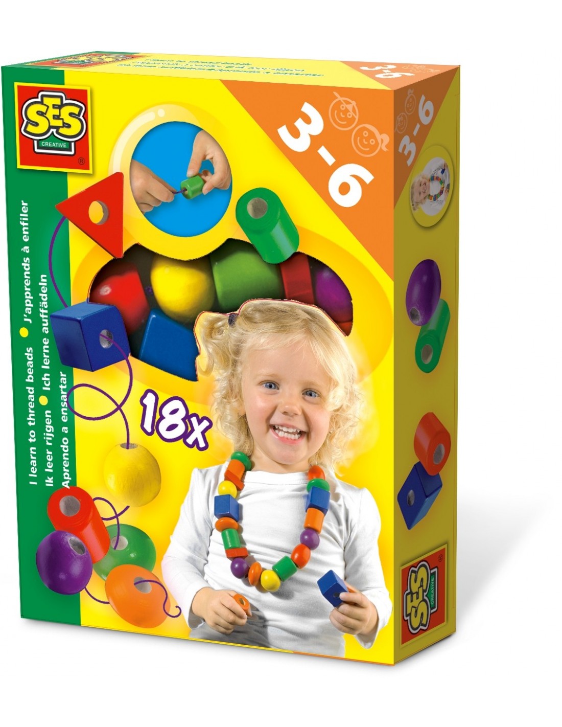 Zestaw do nawlekania korali. Zabawka dla najmłodszych, doskonała do poznawania kolorów, kształtów oraz ćwiczenia koordynacji podczas świetnej zabawy. Zestaw zawiera 18 dużych korali o różnych kształtach i kolorach. Dla dzieci od 3 roku. Wyprodukowano w Holandii.