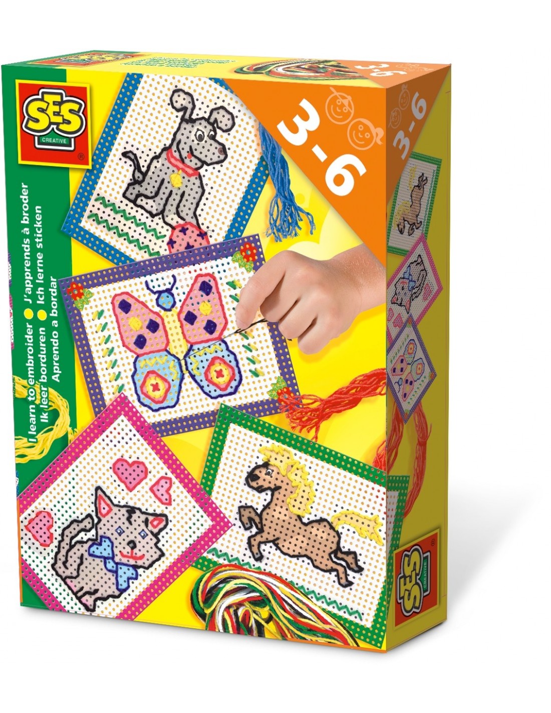 Naucz się używać igły i nici z tym zestawem do haftu. Na dostarczonych kartach z haftami możesz tworzyć zabawne i kolorowe figurki. Wyhaftuj kota, motyla, konia i psa. Karty są wstępnie zadrukowane i perforowane, co ułatwia haftowanie i umożliwia bezpieczne przebicie igły przez otwory.
