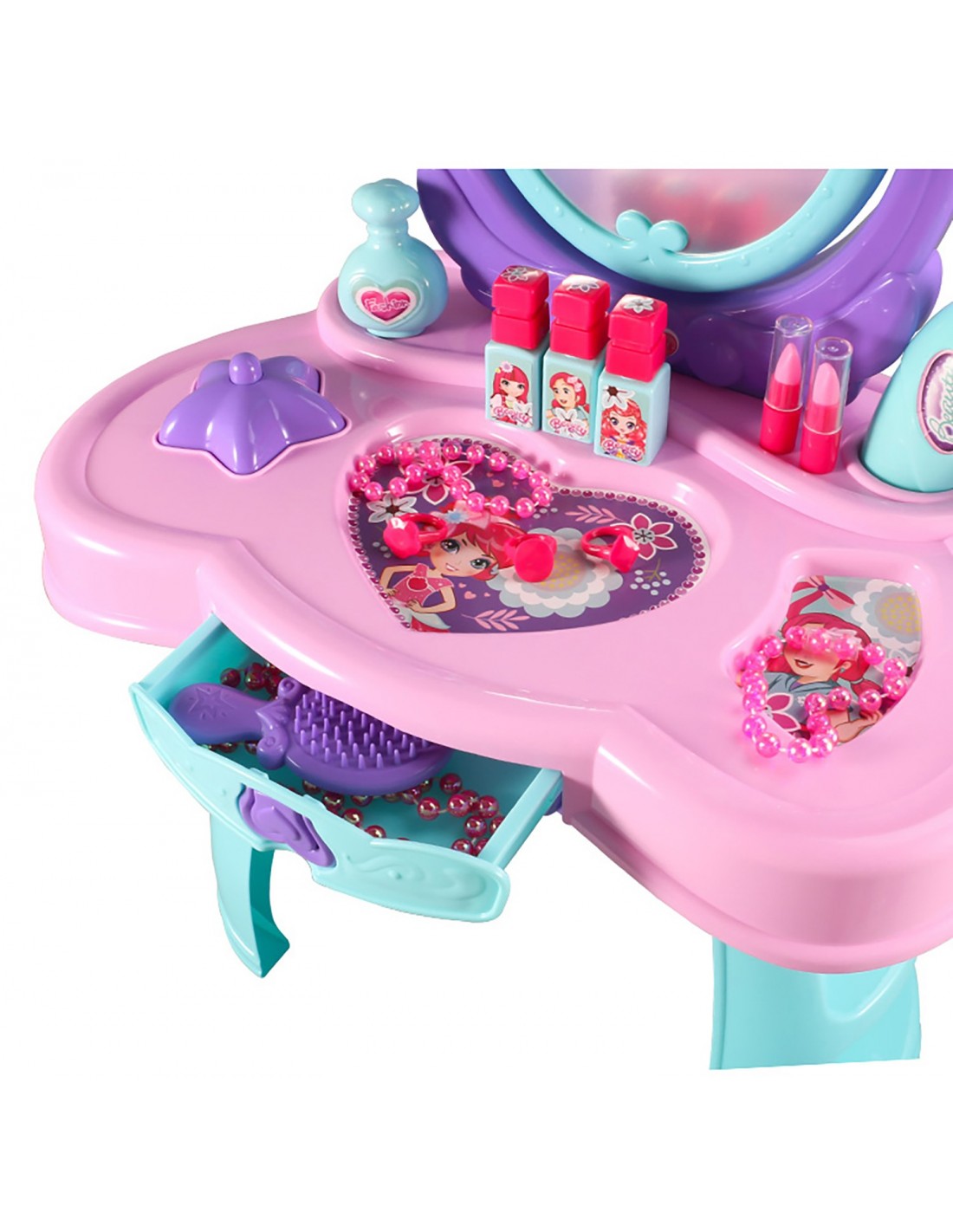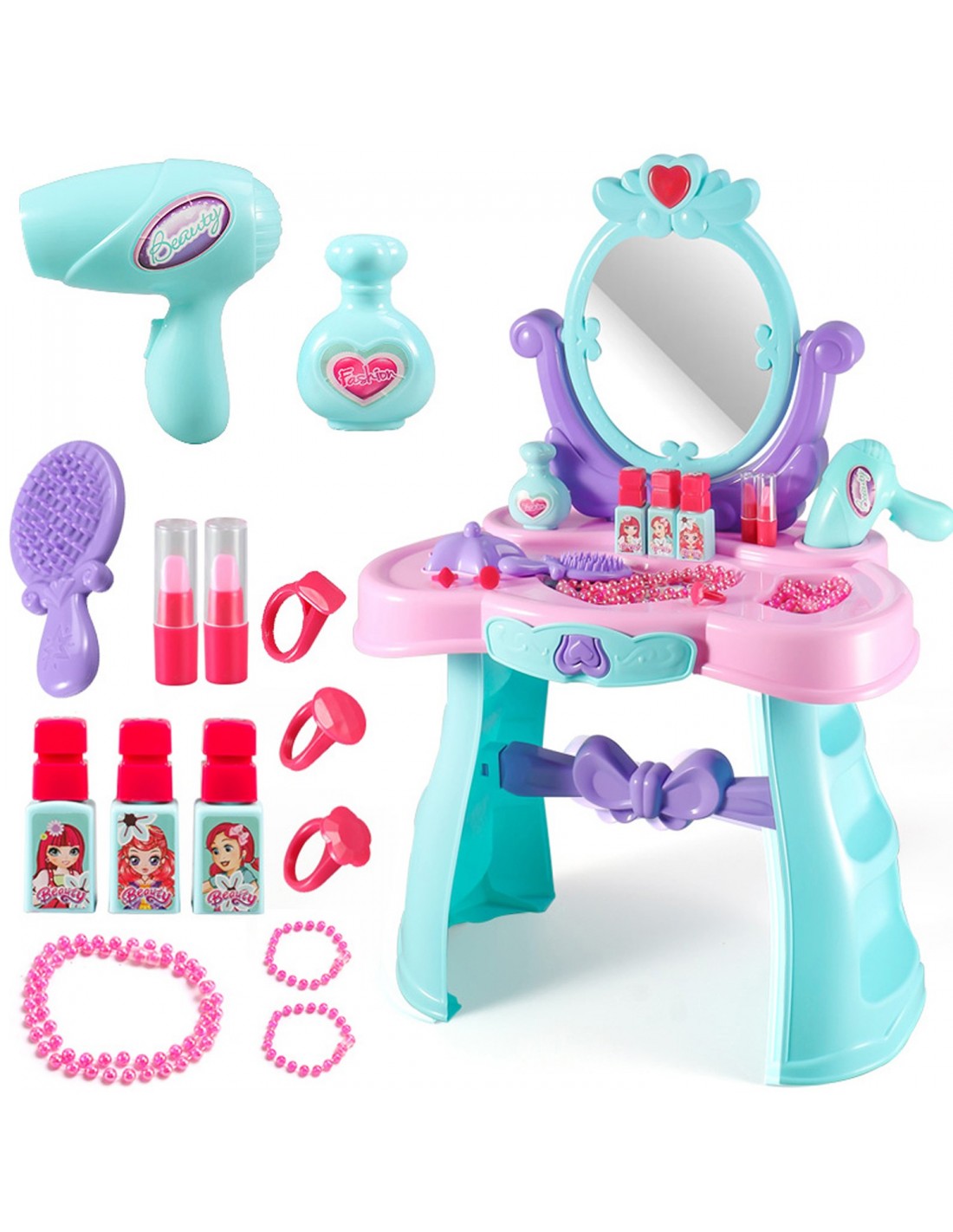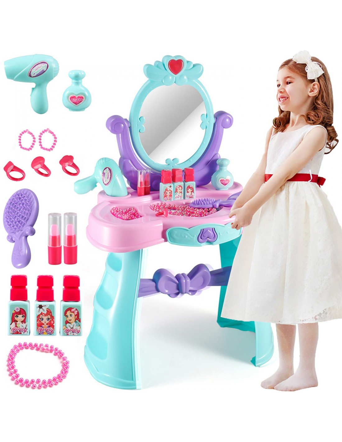 ❤️Fantastyczna zabawka, toaletka dla małej księżniczki! Każda dziewczynka marzy o swoich własnych kosmetykach, przyborach, aby móc poczuć się być dorosłą kobietą. Dzięki temu wspaniałemu zestawowi każda mała dziewczynka, może być jak mama i bawić się w dorosłą kobietę. Wszystkie kosmetyki, to imitacja prawdziwych przyborów jakich używają dorośli.